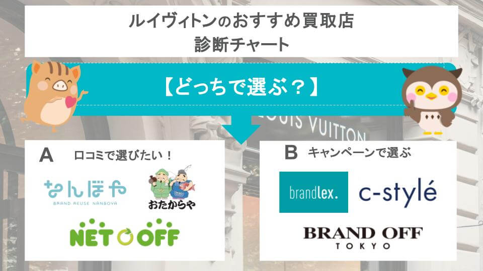 もしお店選びで迷ってしまう方は、以下チャートからおすすめ店を見つけてみましょう。ウリドキではキャンペーン情報・口コミがともに良い買取店をピックアップしています。