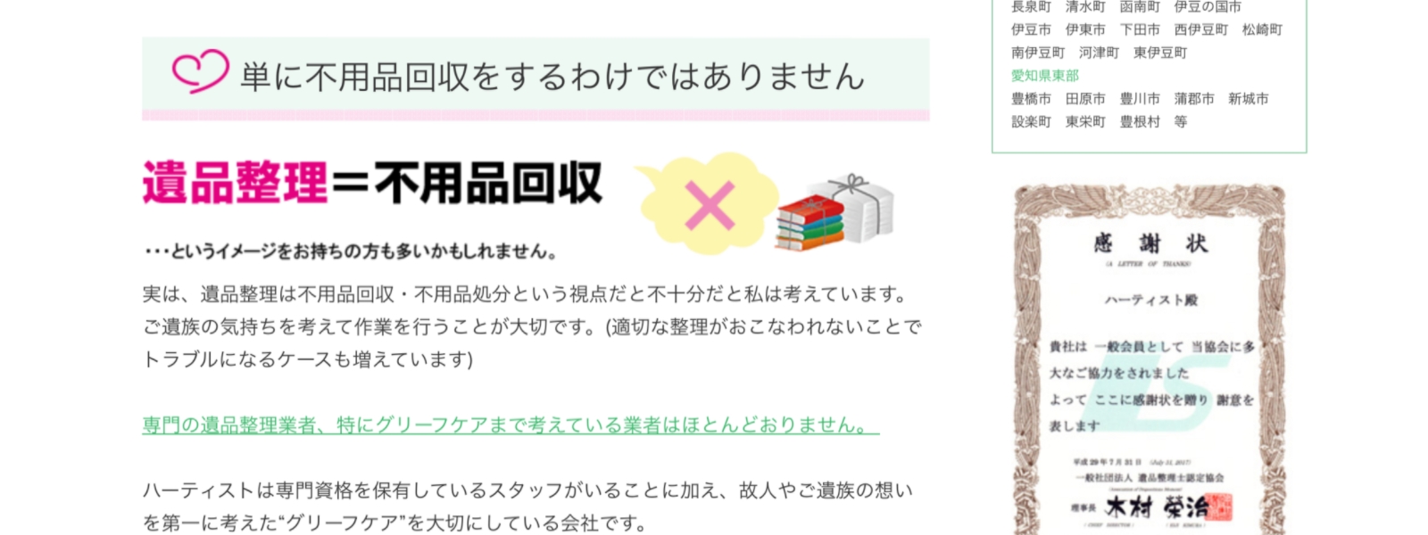 ハーティストは、静岡県全域と愛知県東部でサービスを提供する遺品整理業者です。有資格者のスタッフが在籍し、依頼主の気持ちに寄り添った丁寧な作業を行ってくれます。遺品整理士優良事業所として認定を受けている点も魅力です。