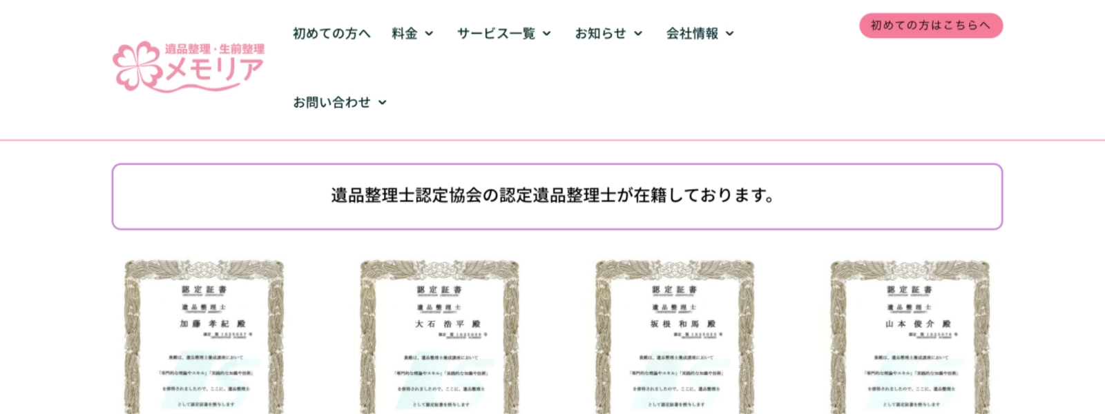 一般社団法人心結の家じまいアドバイザーに認定されています。また、遺品整理士の資格を持つスタッフが多く在籍し、遺品整理に関するさまざまな悩みへの親身な対応が期待できるでしょう。