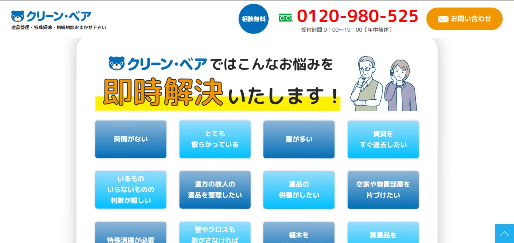 クリーン・ベアは、相談料が無料の遺品整理業者です。対面での相談だけでなく遠方に住んでいるなどの事情がある場合は、電話やオンラインで対応してくれることもポイント。忙しくて時間が取れない人や、足を運ぶことがむずかしい場合におすすめの業者です。