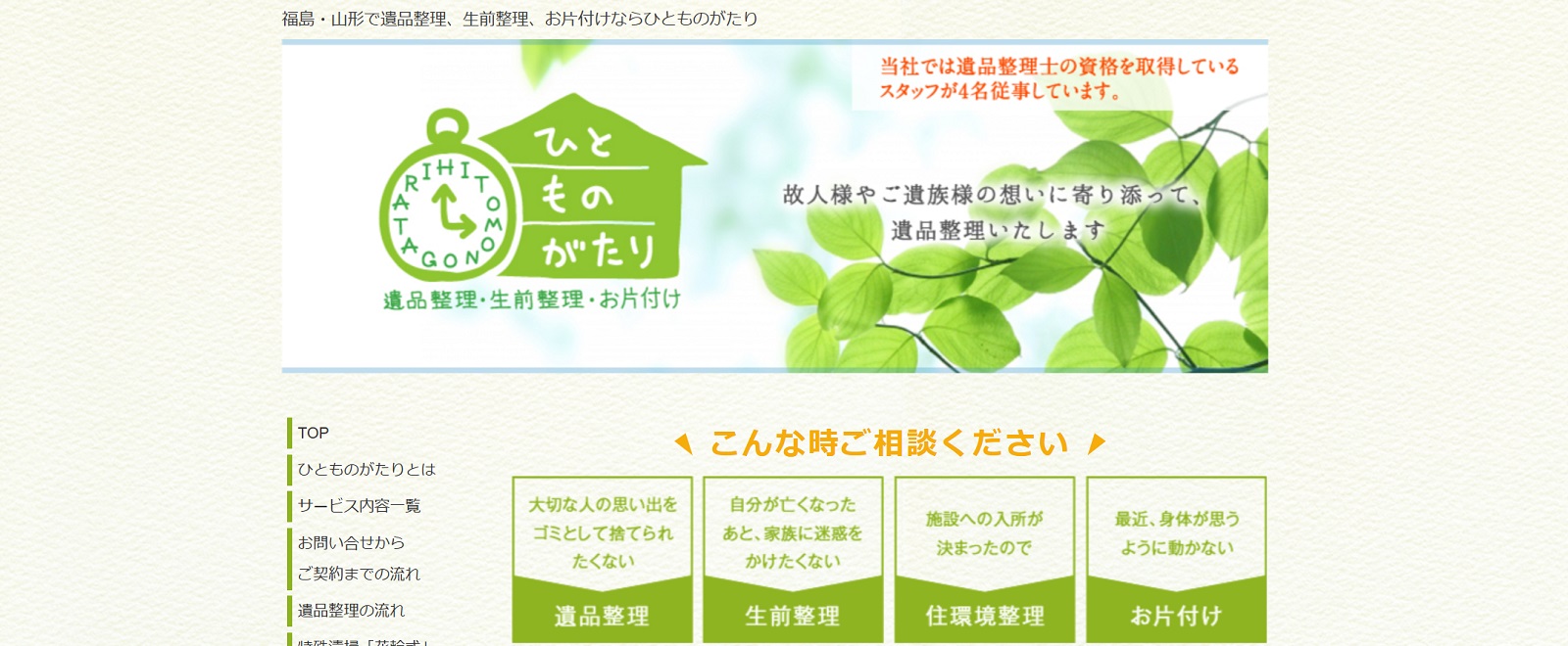 ひとものがたりは、遺品整理や生前整理、住環境の整理の専門サービス店です。福島市や伊達市などに加え、山形県の一部エリアも対象に、自宅や指定場所へ訪問します。