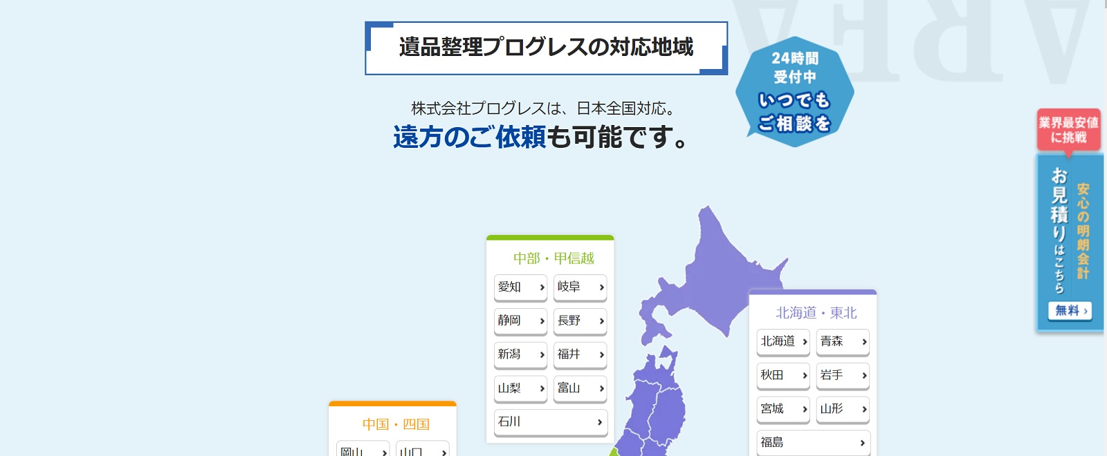 福島県内では福島市など、一部のエリアに対応しています。地域によっては別途交通費が発生するので、見積もり時に必ず確認しておきましょう。