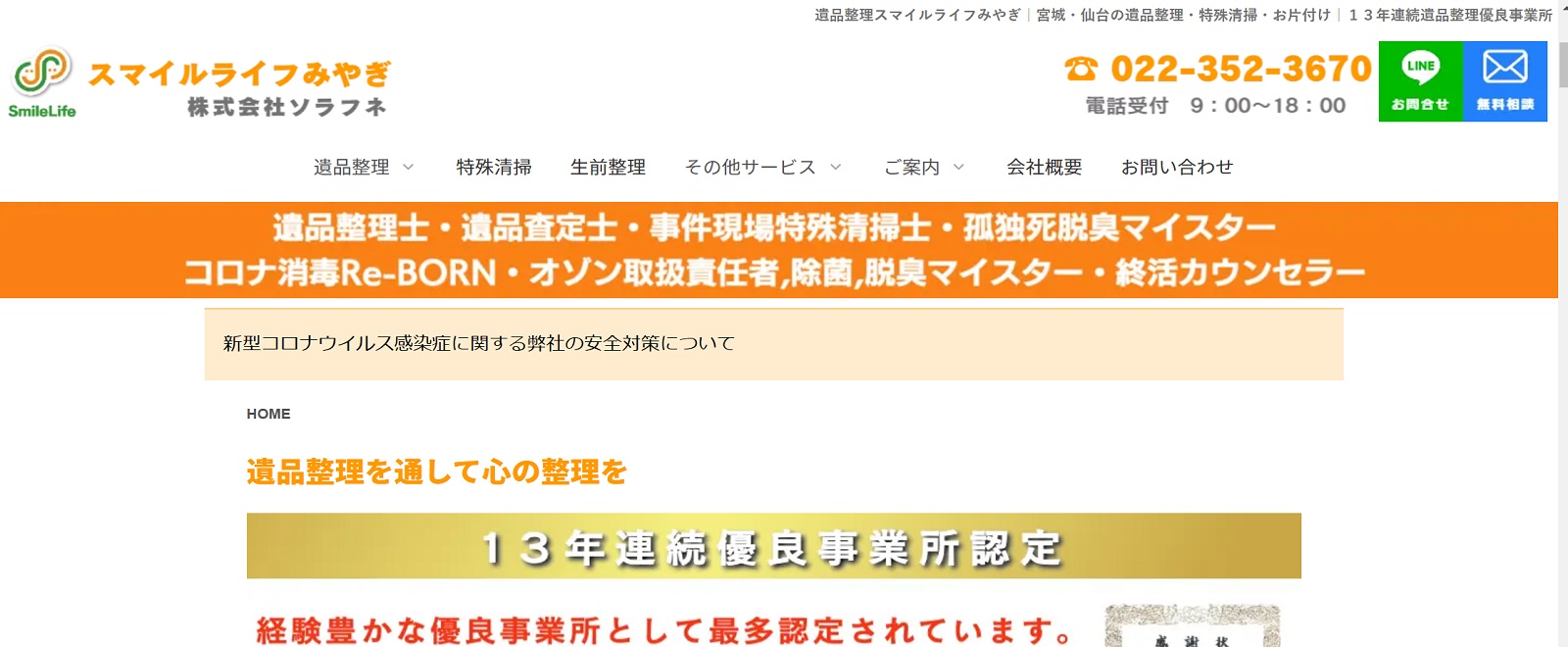 スマイルライフみやぎは、東北エリアにサービスを展開する遺品整理専門会社です。遺品整理士や事件現場特殊清掃士、終活カウンセラーなど、必要資格を多く取得しています。