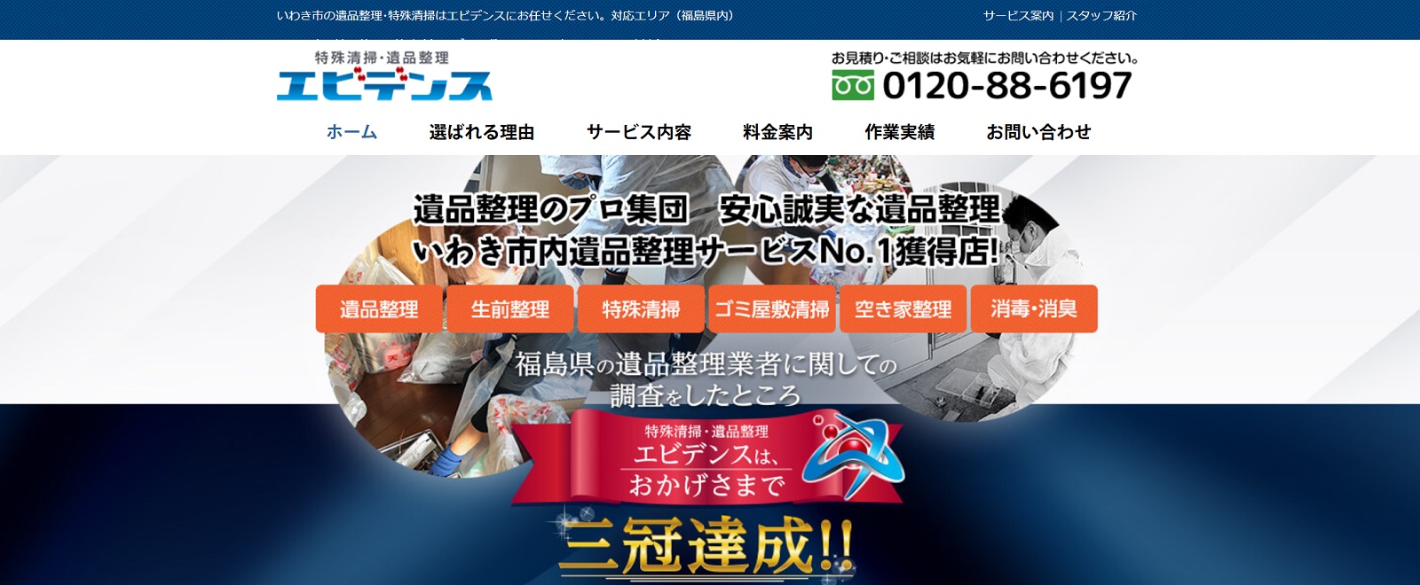 エビデンスは、遺品整理や特殊清掃を行う専門店です。福島県内における遺品整理関連調査にて、「知人におすすめしたい」部門などで3冠を達成した実績があり、多くの人に選ばれています。