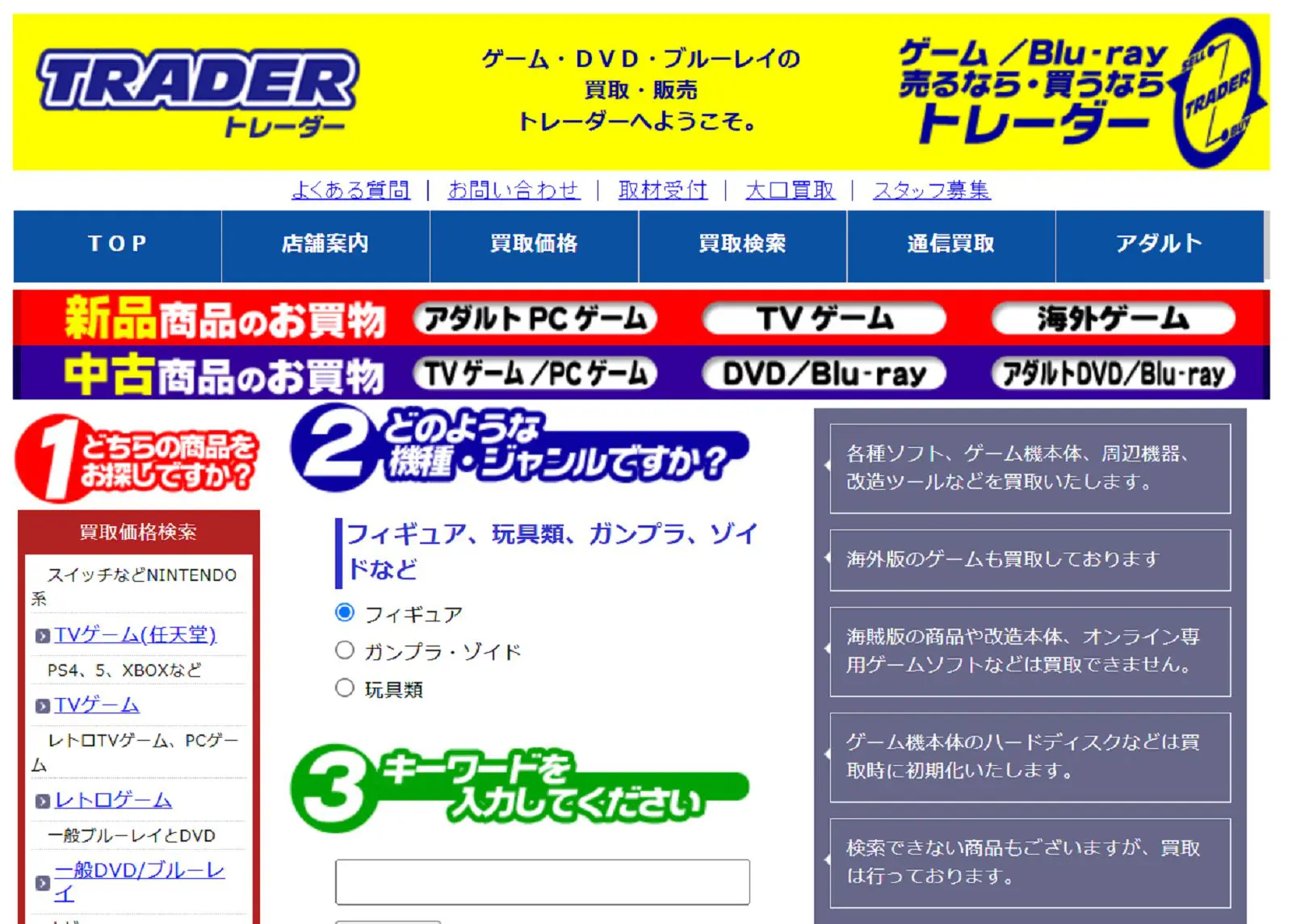 | トイフォレスト | 詳細へ | – | 最短即日訪問 | 〇 | 〇 | – | あり | 石川県 | 日本全国 | 年中無休 | – | フィギュア、ゲーム、DVDなど | 第302221308001号 |