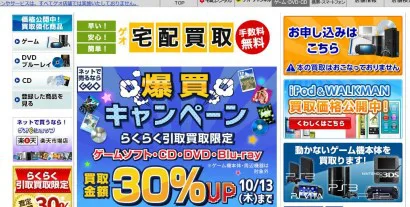 2016年9月現在で京都府内に13店舗を展開、うちゲーム買取を実施しているのは12店舗です。ゲオのゲーム買取は、店頭よりもゲオオンラインから申し込んで宅配買取を利用する方がお得。現在「らくらく引取買取」を申し込むと、買取価格30%アップの爆買キャンペーン実施中です。宅配送料を無料にするには商品数の制限がありますが、売りたい商品が大量にある時には、この30%アップキャンペーンは見逃せません!