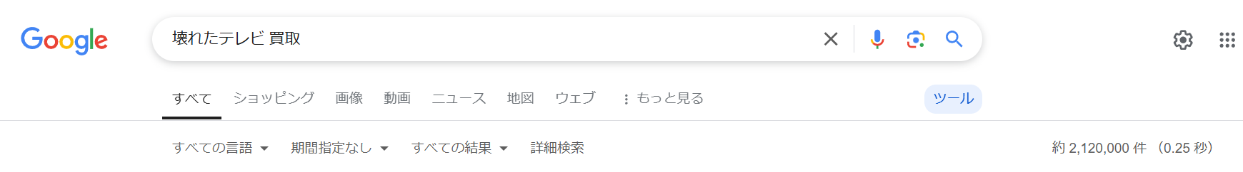 Googleで「壊れたテレビ 買取」と検索すると、90万件ほどの検索結果があり、買取店のページや多くの記事が出てきます。