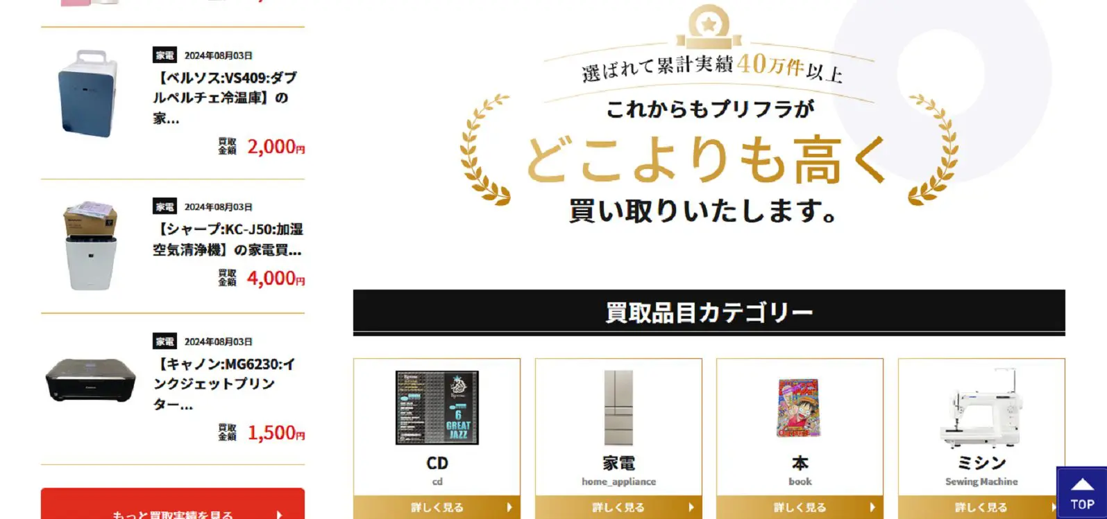 | プリフラ | 詳細へ | – | 出張買取は最短即日訪問 | – | ○ | – | – | – | 東北、関東、中部、近畿など | 年末年始(問い合わせ) | 9:00~18:45(問い合わせ) | 大型テレビ、家電、本、ミシンなど | 第305551604692号 |