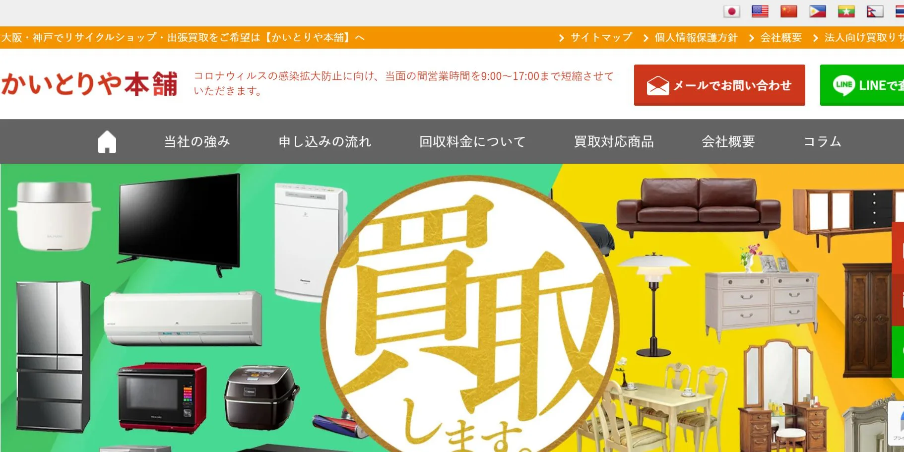 かいとりや本舗は兵庫・大阪を対象とした出張買取店です。家具以外に家電や骨董品、着物、楽器なども買取しています。自宅にある不要な商品をまとめて売りたい方におすすめです。