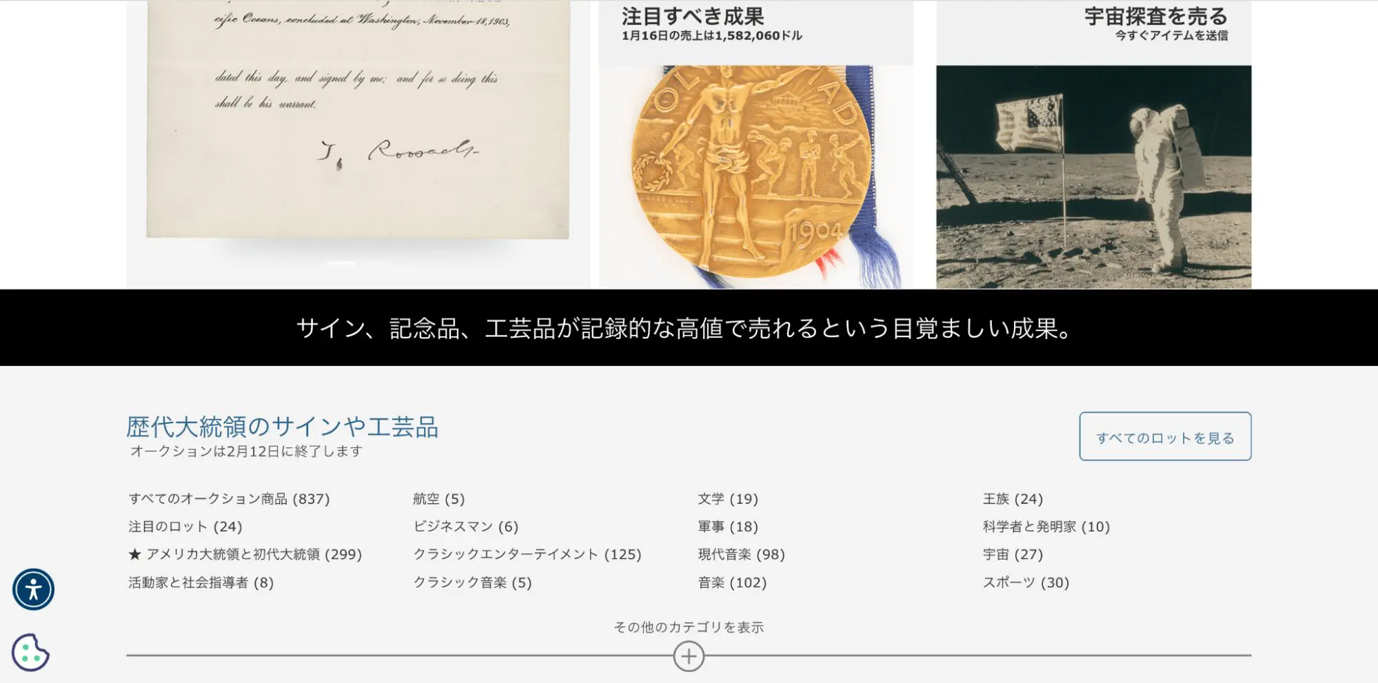 著名人の直筆の手紙やサイン、プロスポーツやオリンピックの記念品、工芸品などが高値で売れるため、世界中の人が出品しています。