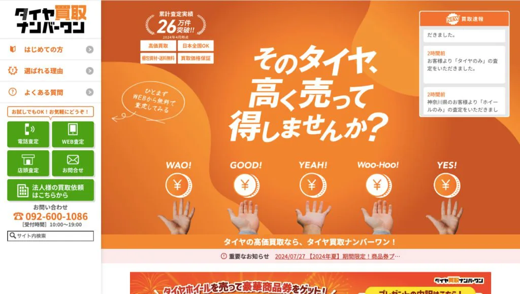 タイヤ買取ナンバーワンは、タイヤ・ホイール買取の専門店。タイヤについて多数の買取実績を誇り、豊富な知識を持つ査定士が対応してくれるから、不安なくタイヤを査定に出せることでしょう。