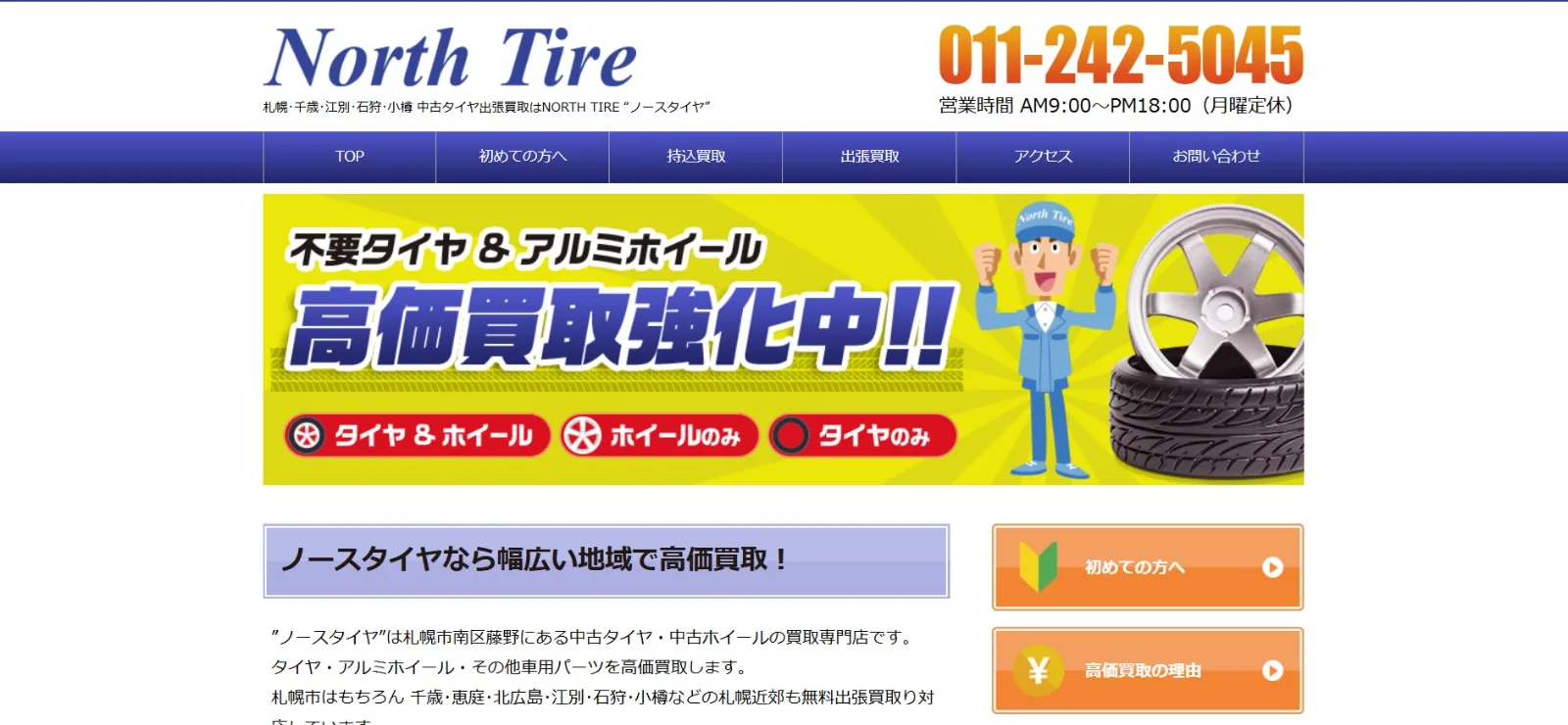 詳細へ | ★★★★☆4.4 | タイヤ・ホイールに特化した買取専門店 | – | ○ | ○ | – | 北海道札幌市南区 | 札幌、千歳、江別、石狩、小樽近郊 | 月曜日 | 9:00〜18:00 | タイヤ、ホイール | – |