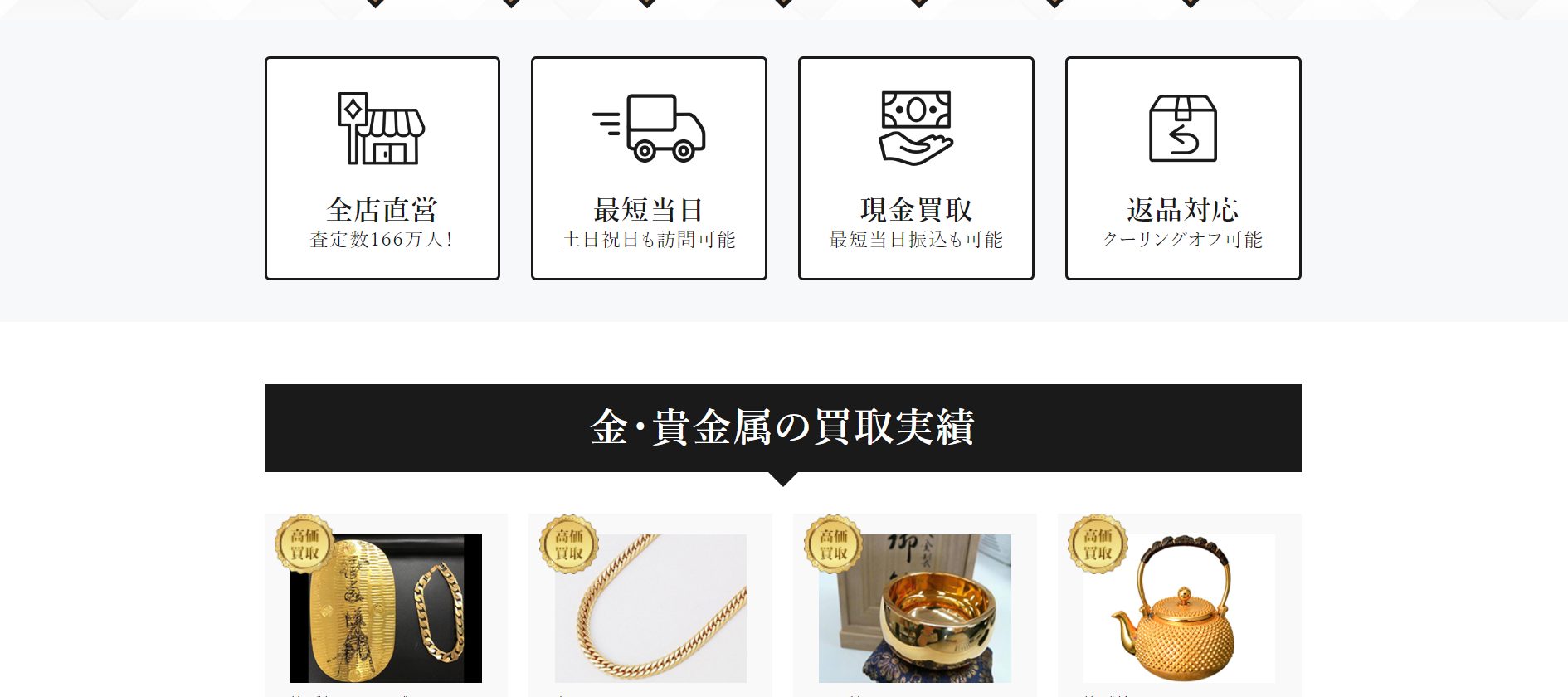 | THE GOLD(ザ・ゴールド) | 詳細へ | ★★★★☆4.6 | 査定数165万人以上の実績 | ○ | ○ | ○ | あり | 北海道、宮城、富山、広島、愛媛など | 全国 | 年末年始(問い合わせ) | 9:00~18:00(問い合わせ) | 金・貴金属、ブランドバッグ、時計など | 第301030608093号 |