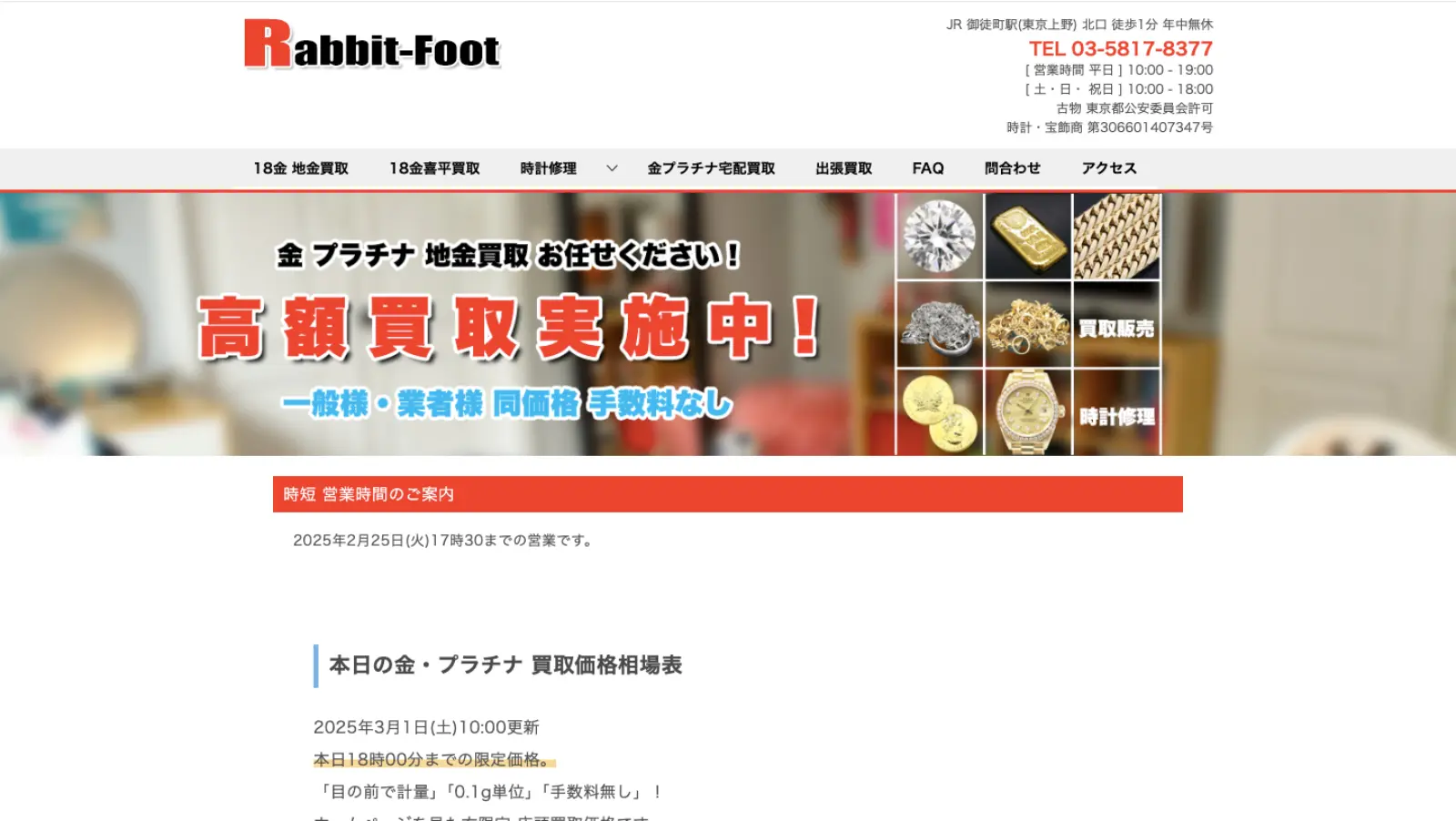 詳細へ | ★★★★☆4.4 | 御徒町駅から徒歩5分 | ○ | – | ○ | あり | 東京都台東区 | – | 土日 | 10:00~19:00 | 貴金属、ダイヤモンド、色石など | 第306631007824号 |