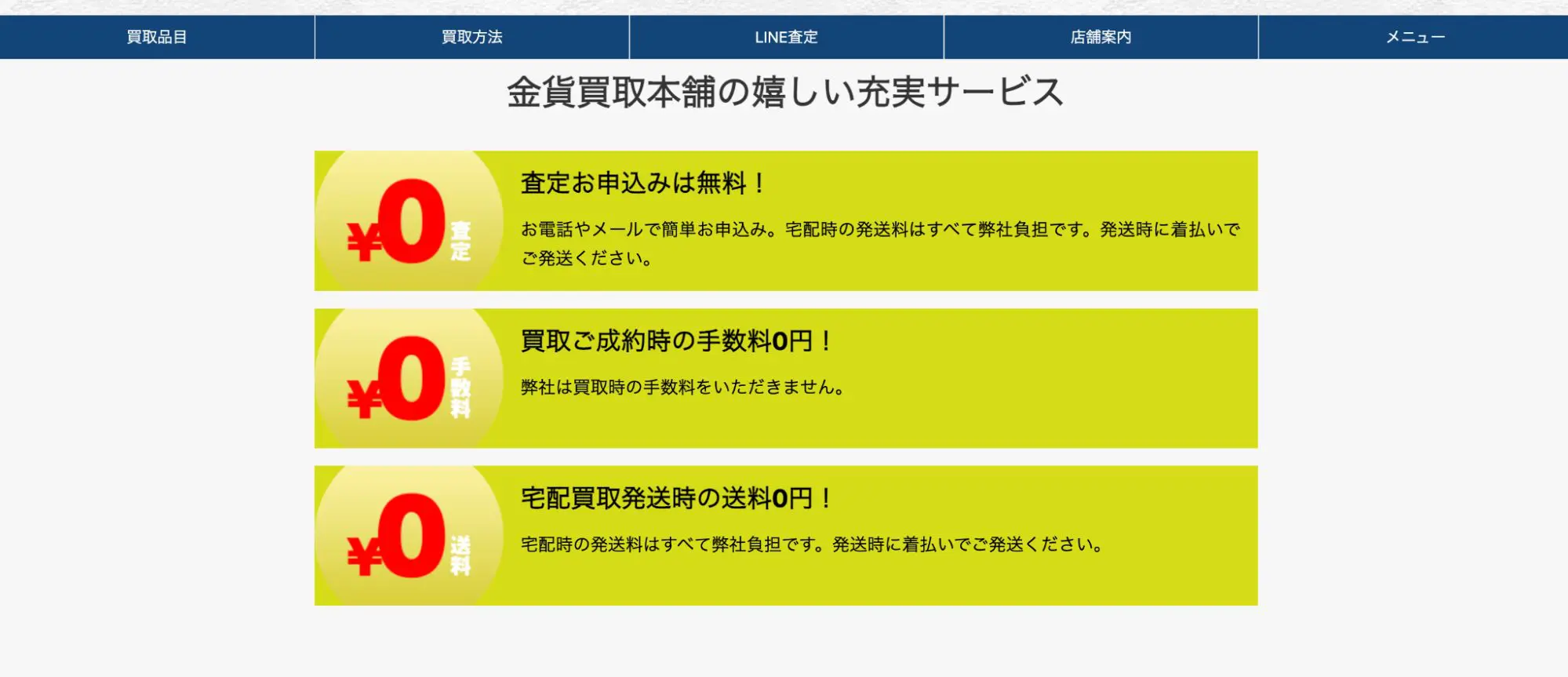 詳細へ | ★★★★☆4.8 | 金製品は当日相場で量り売り。経験豊富なスタッフが対応。 | ○ | ○ | ○ | あり | 関東・関西 | – | 年中無休(年末年始除く) | 11:00~19:45 | 金、プラチナ、ダイヤ、宝石、ブランド品、時計、切手、衣類、金券 | 第304362320013号 |