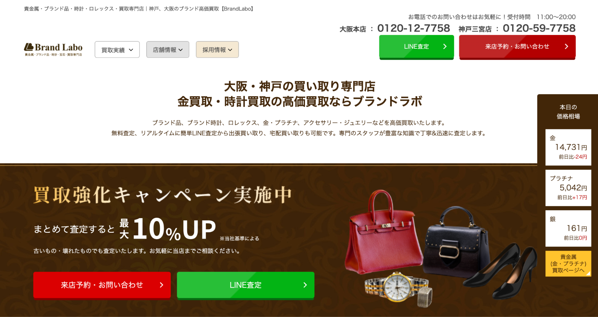 | ブランドラボ 大阪本店 | 詳細へ | ★★★★☆4.9 | なんば駅14番出口から30秒。買取成立で駐車料金サービスあり。 | ○ | ○ | ○ | あり | 大阪、兵庫、東京、奈良 | – | 年中無休 | 11:00~20:00 | 金、ダイヤ、宝石、ブランド時計、バッグ、ジュエリーなど | – |