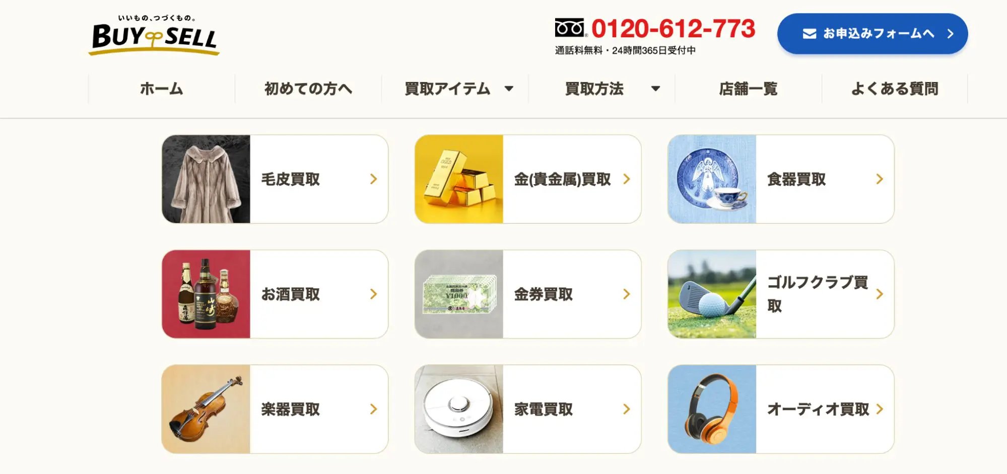 詳細へ電話する | ★★★★☆4.7 | 全国1350店舗以上展開。業界屈指の店舗数による豊富な買取参考価格。 | × | ○ | ○ | – | 大阪府 | 日本全国 | 年中無休 | 10:00~19:00 | 金、貴金属、宝石、時計、バッグ、お酒、切手、古銭、カメラなど | 第304361407260号 |