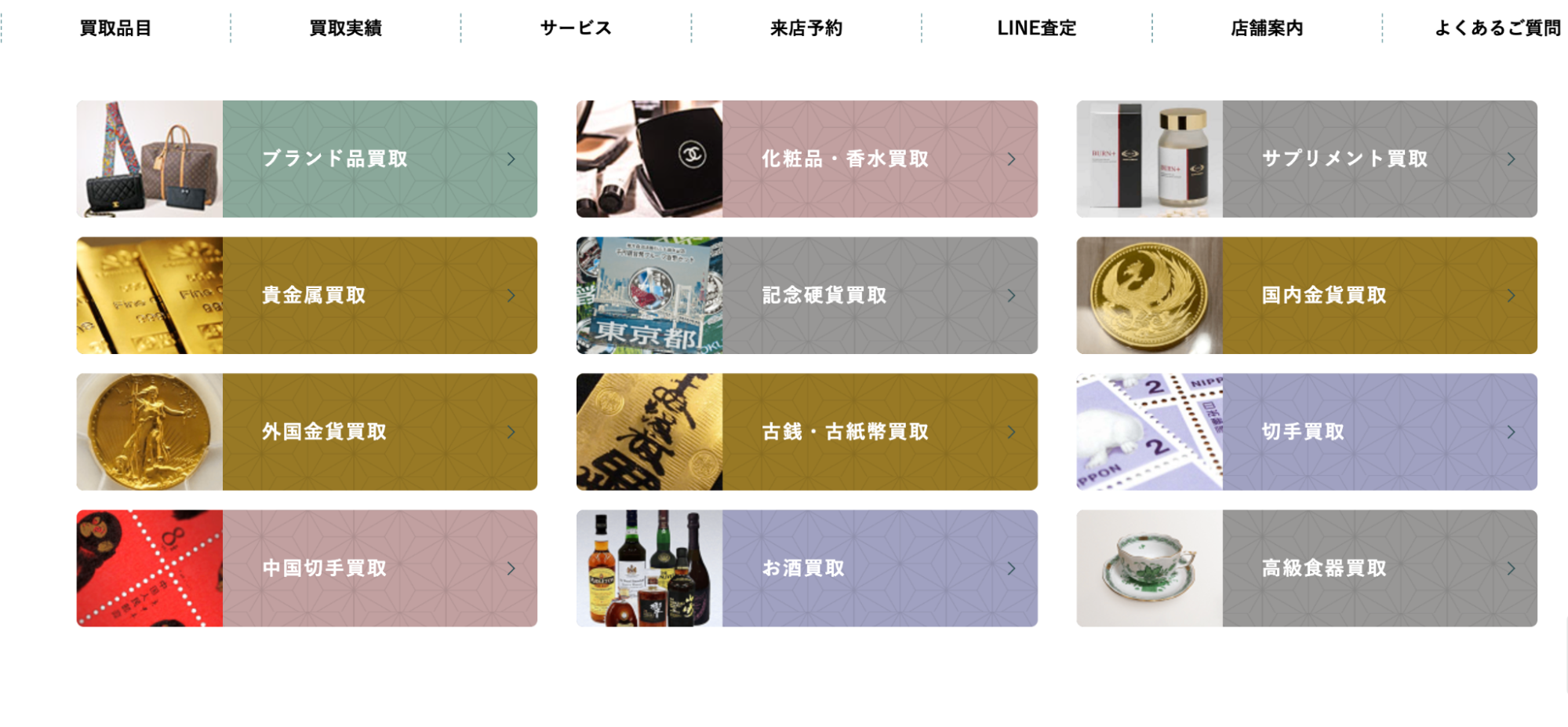 詳細へ | ★★★★☆4.9 | 新庄剛志氏がイメージキャラクター。大正ロマン風の店内で幅広い品目を査定。 | ○ | ○ | ○ | – | 全国 | 一部地域 | 不定休 | 10:00~19:00 | カメラ、骨董品、お酒、刀剣、ブランド品、ジュエリー、時計、おもちゃ、切手、古銭など | – |