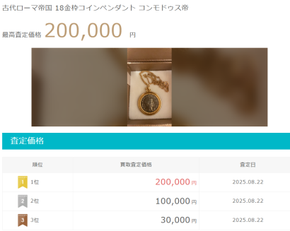 ひとつの18金製品に各買取店が提示する金額はさまざまです。たとえば、一括査定サービス「ウリドキ」では、「古代ローマ帝国 18金枠コインペンダント コンモドゥス帝」に対して、以下の画像のとおり業者ごとに異なる買取査定価格が提示されました。