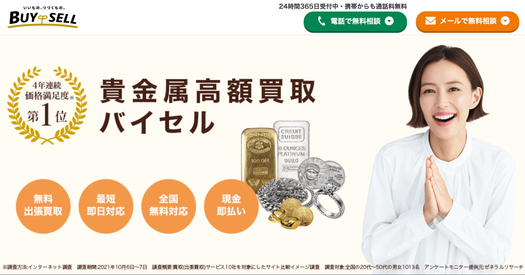 | バイセル【PR】 | 詳細へ電話する | ★★★★☆4.9 | 買取初心者も安心のサポート体制 | ○ | ○ | ○ | あり | 東京、神奈川、大阪、名古屋 | 全国 | 店舗による | 店舗による | 金・貴金属、ブランド品、時計など | 第301041408603号 |