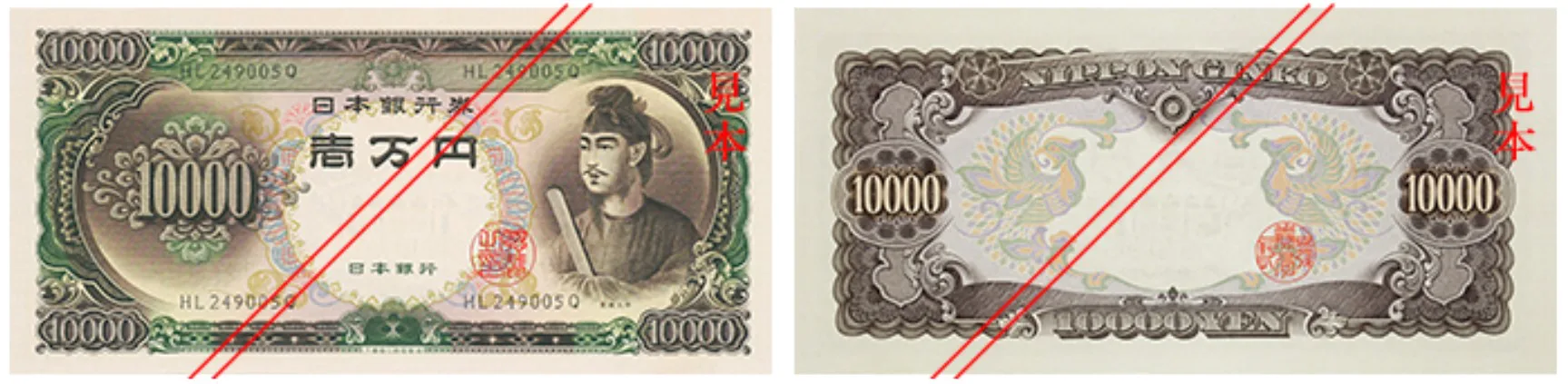 聖徳太子C一万円券は、日本ではじめて印刷された一万円札です。表面の右側には聖徳太子の肖像が、その左下には日本銀行総裁の印章が記されています。裏面には左右に向かい合う鳳凰がデザインされており、右下に日本銀行の発券局長の印章があることが特徴です。