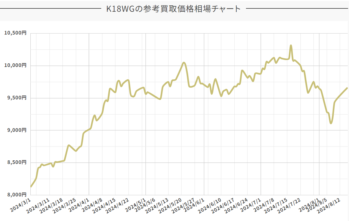 2025年5月上旬での買取価格はおよそ12,709円と、直近半年間では買取価格が高めなのでホワイトゴールドの売り時といえるでしょう。