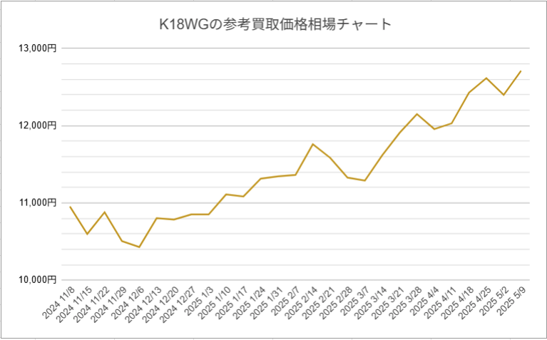 2025年5月上旬での買取価格はおよそ12,709円と、直近半年間では買取価格が高めなのでホワイトゴールドの売り時といえるでしょう。