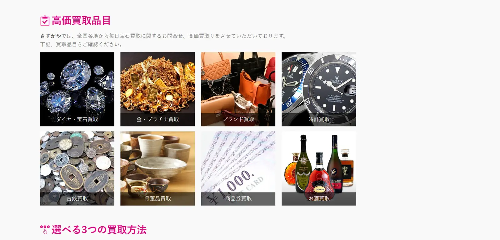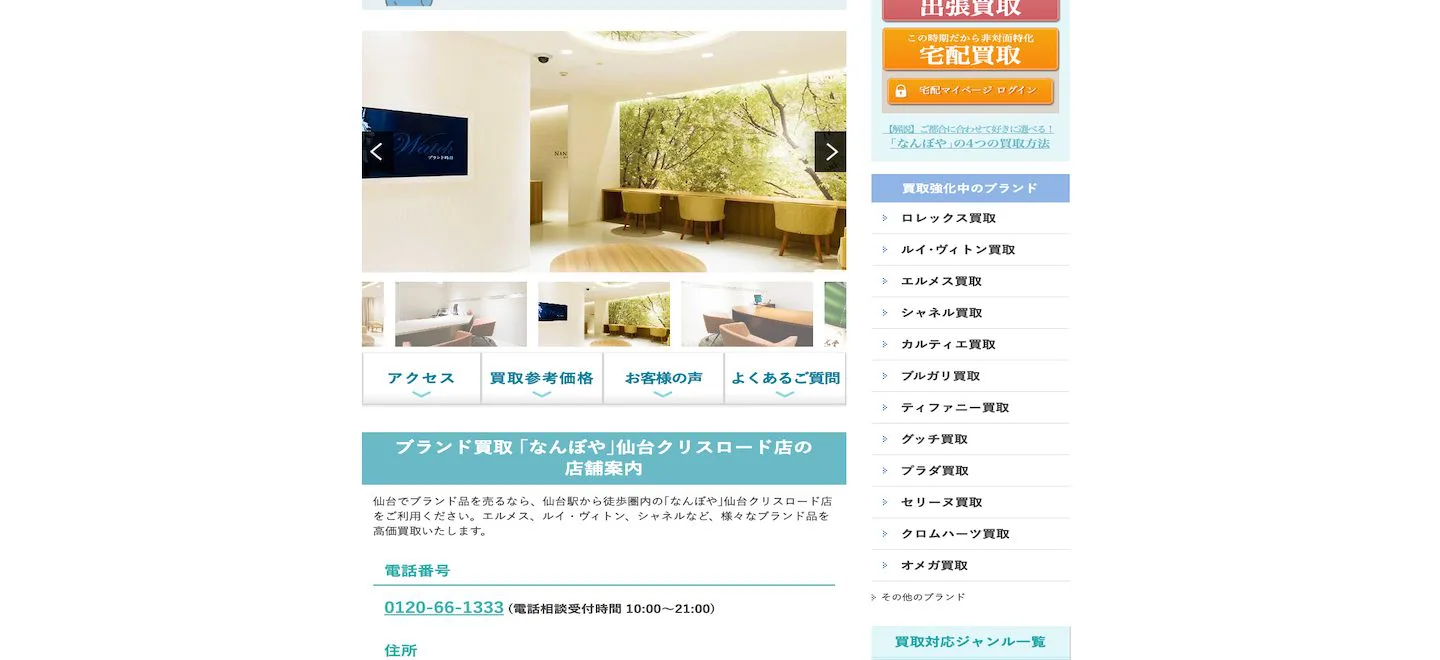 買取方法は店頭、出張、宅配の3種類に対応。店舗は仙台に3つあり、どこもサービス力は変わらず素晴らしいので、利用しやすい店舗を選ぶと良いでしょう。