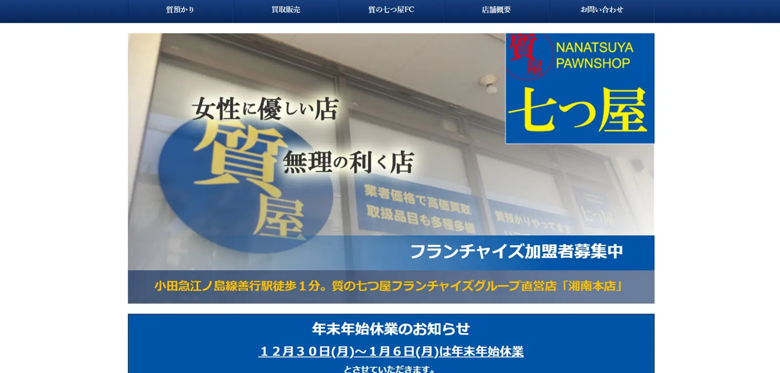 詳細へ電話する | ★★★★☆4.7 | 全国1,300店舗以上展開 | – | ○ | ○ | – | 福島県郡山市 | 全国 | 年中無休 | 10:00~19:00 | ブランド品、時計、金・貴金属、宝石など | 第304361407260号 |