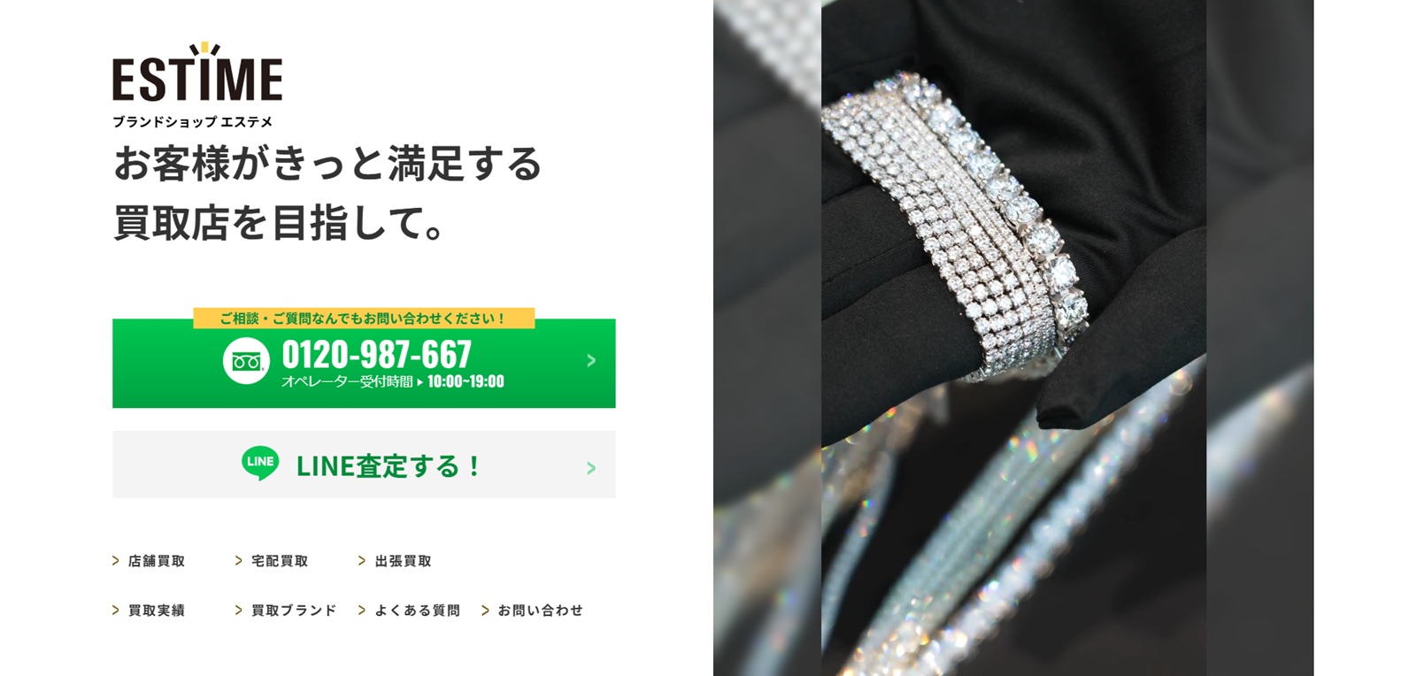 ダイヤモンドや宝石などの買取に力を入れていて、通常は重さのみで査定額を決める買取店が多いなか、買取大吉は重さだけでなくデザイン性も考慮。他店ではあまりいい値段がつかなかったものでも、買取大吉なら高価買取が期待できるでしょう。