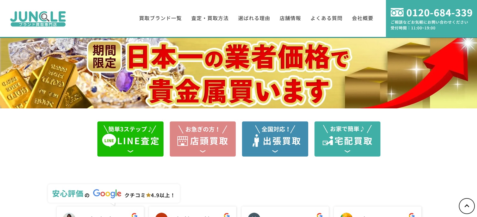 詳細へ | ★★★★☆4.5 | 買取専用フロアで相談しやすい | ○ | ○ | ○ | あり | 東京都渋谷区 | 東京、埼玉、千葉、神奈川、京都、大阪、兵庫 | 水曜日 | 11:00~20:00 | ダイヤモンド、ブランド品、時計など | 第541162007700号 |