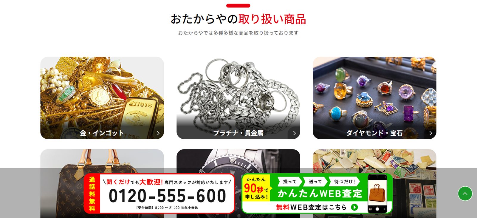 詳細へ | ★★★★☆4.8 | 取り扱いジャンルが豊富 | ○ | ○ | ○ | あり | 東京都新宿区 | 要問い合わせ | 年中無休 | 11:00~19:00※土日祝11:00~18:00 | 金・貴金属、ダイヤモンド、プラチナなど | 第301111006411号 |