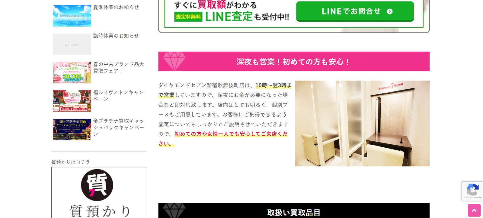 詳細へ | ★★★★☆4.9 | 予約不要で深夜まで営業 | ○ | – | ○ | あり | 東京都新宿区 | – | 盆、年末年始 | 10:00~翌3:00 | バッグ、時計、ダイヤモンド・宝石など | 第621110161046号 |