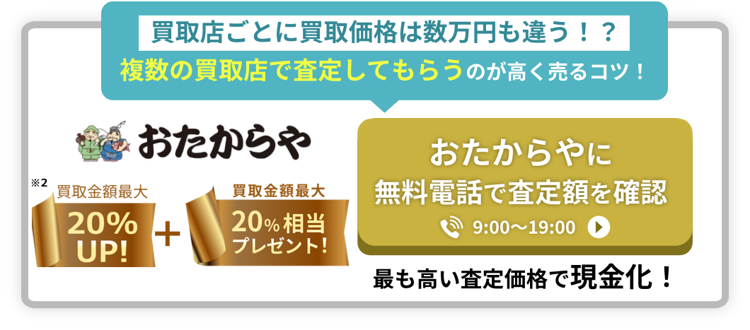 ※1:電話でのお問い合わせ対応は一切承りかねます。※2:ウリドキ限定キャンペーンは期間の定めがないキャンペーンです。予告なく終了する場合もございます。予めご了承ください。※3:ご成約金額10万円以上の方を対象に、成約金額の20%相当(上限10万円)をプレゼントします。※4:各社キャンペーン期間:おたからや 2026年1月18日まで、買取大吉 2026年2月1日まで、バイセル 2026年1月31日まで、ブラリバ 期間の定めなし※5:キャンペーンの対象商品/適用条件は店舗にお問い合わせください。