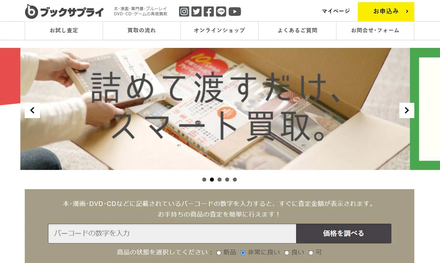 ブックサプライの買取は、スマホひとつでネットでの申し込みが簡単に行えます。公式サイト内の「お申込み」ボタンを押して、必要な事項を入力するだけで完了です。