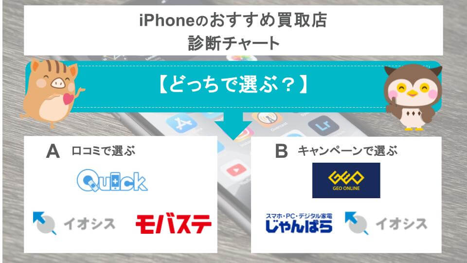 もしお店選びで迷ってしまう方は、以下チャートからおすすめ店を見つけてみましょう。ウリドキではキャンペーン情報・口コミがともに良い買取店を紹介します!