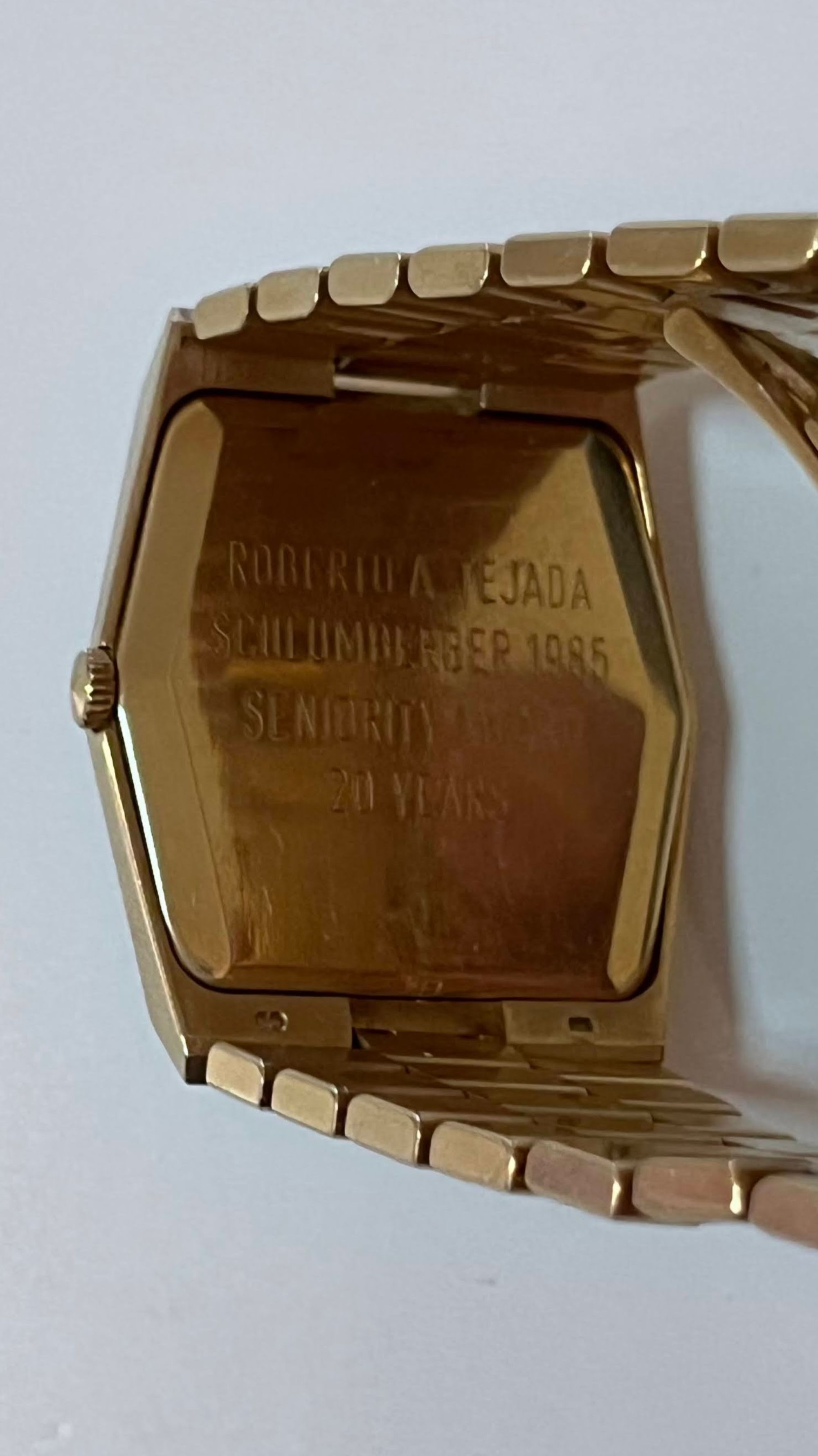 父が1985年に会社勤務20年でもらった時計です。背面に名前などの文字もあります。同名の私は15年前に父からもらいました。