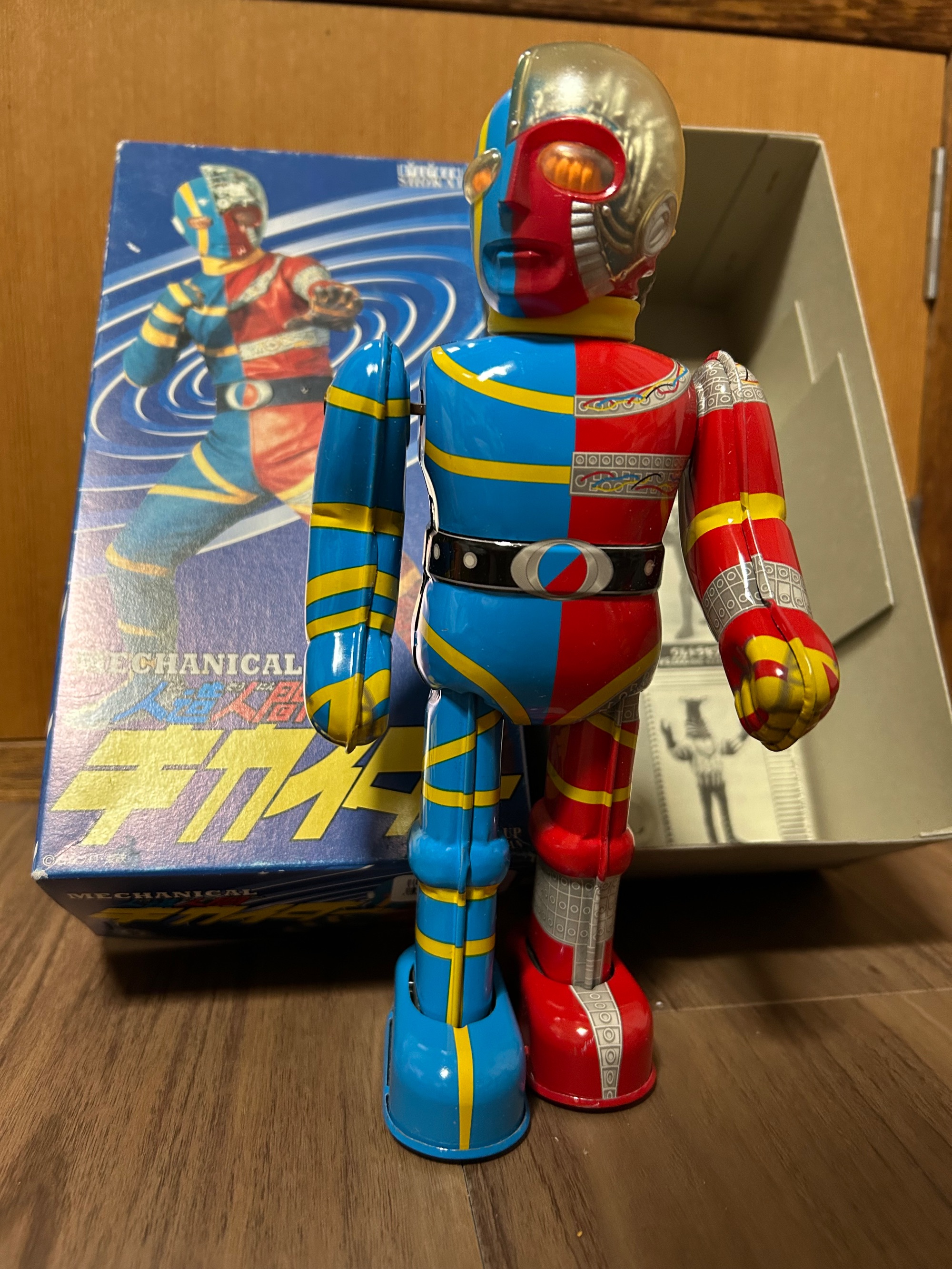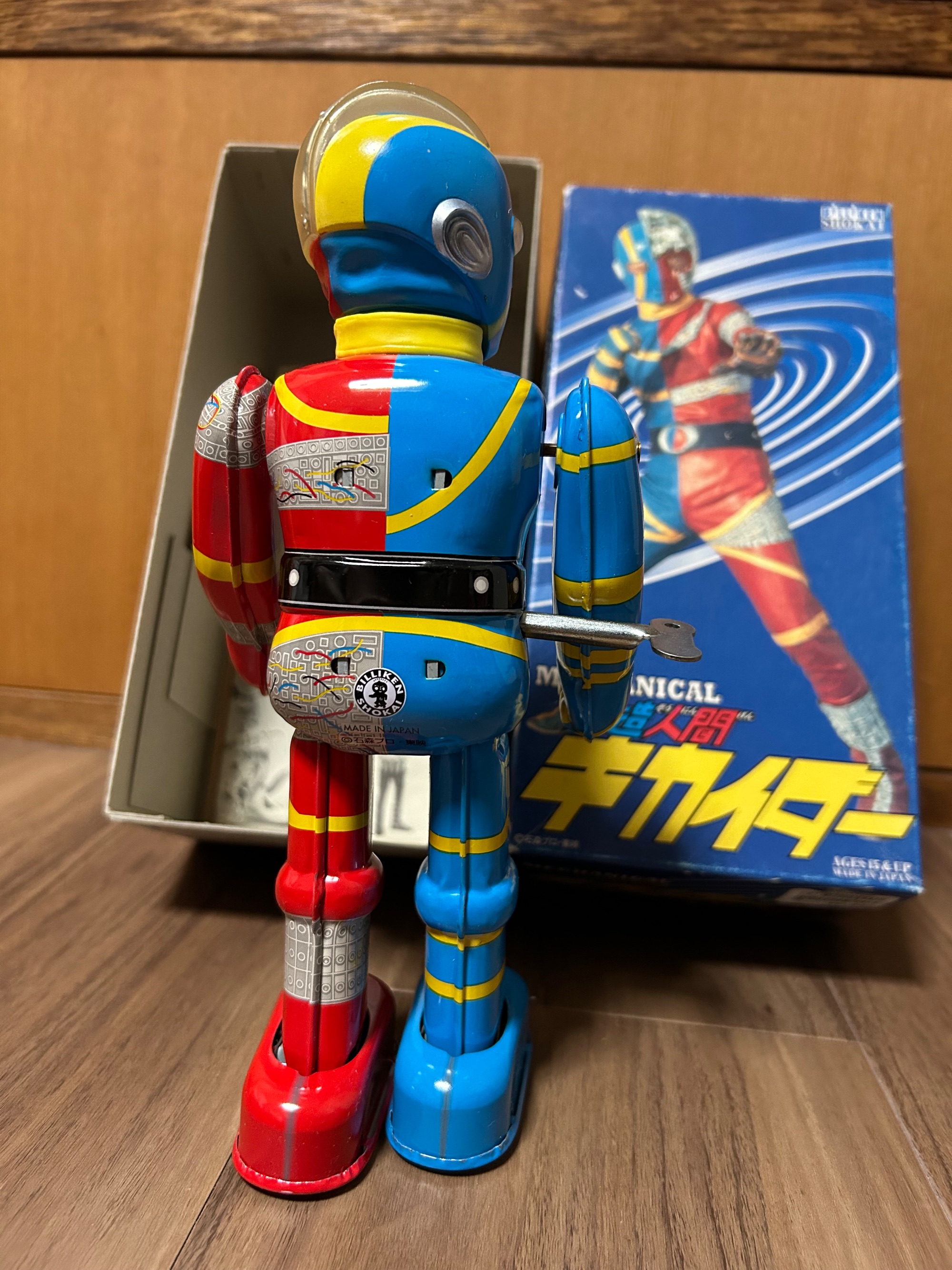 30年位前に上野の松坂屋で購入しました。キカイダーの復刻版のブリキの玩具でゼンマイで動きます。完全可動確認済み。