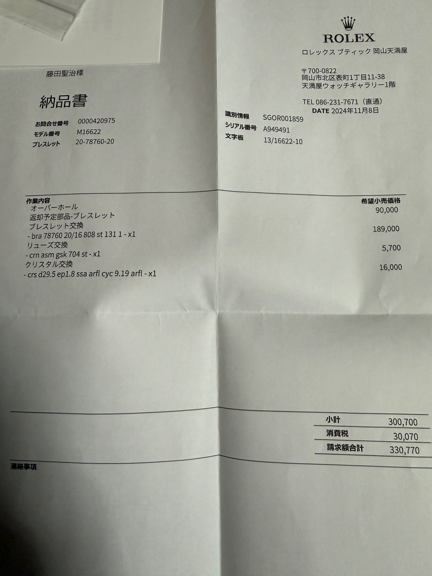 ブレスコマ1つ、正規店にてオーバーホール時にブレス、リューズ、クリスタルガラス新品交換、ケース、ベゼル磨き新品仕上げしてます。オーバーホールから帰って来てからは未使用。