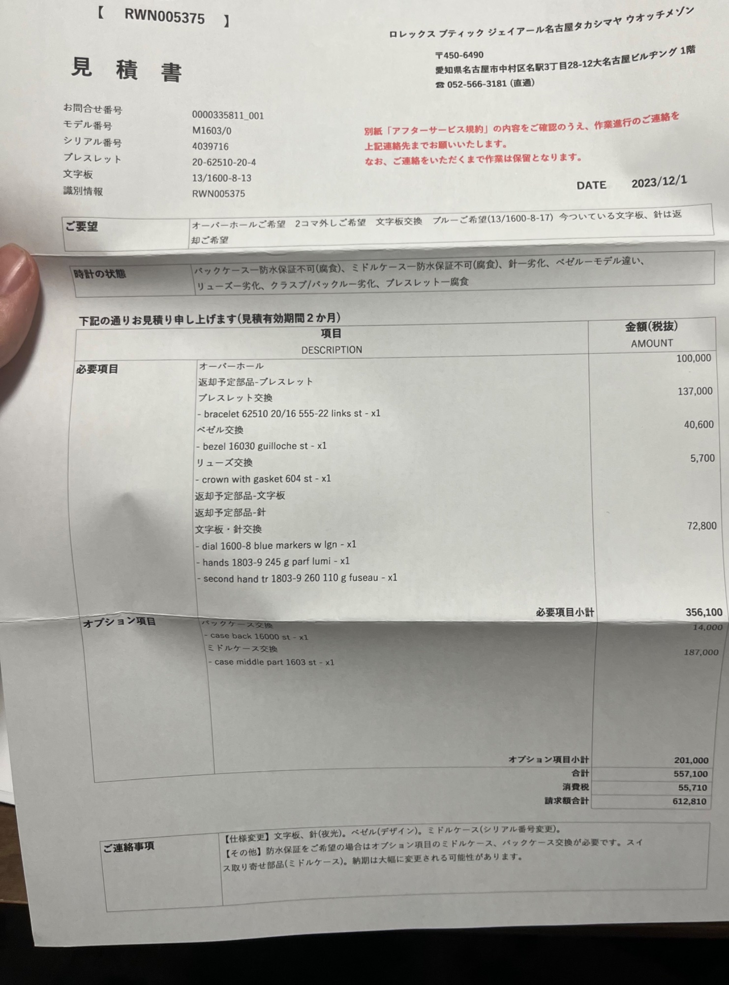 オーバーホールの見積もりをとった写真も貼っておきます。