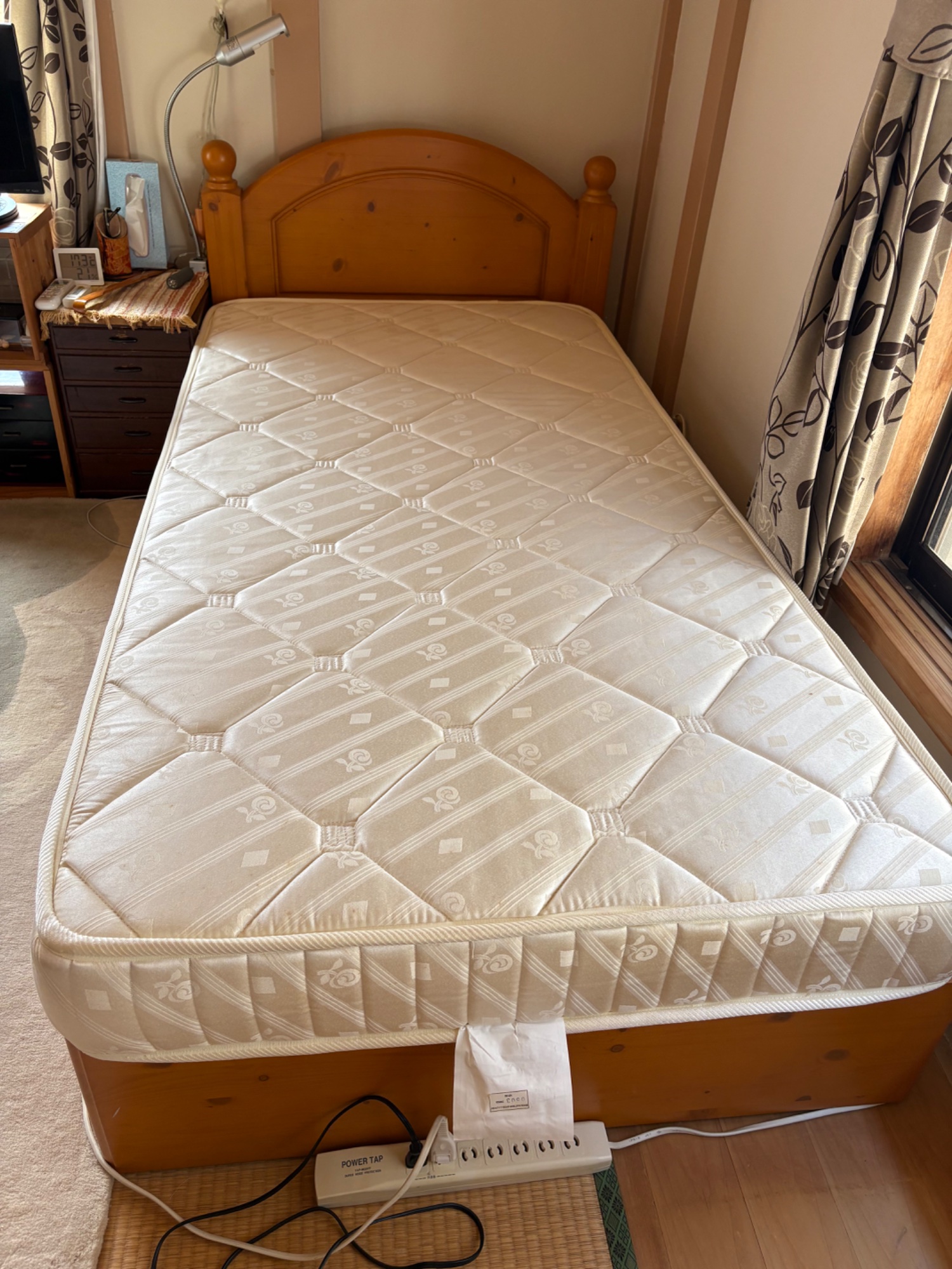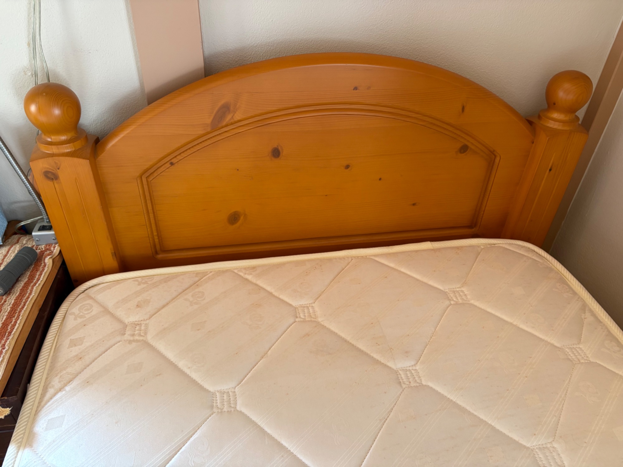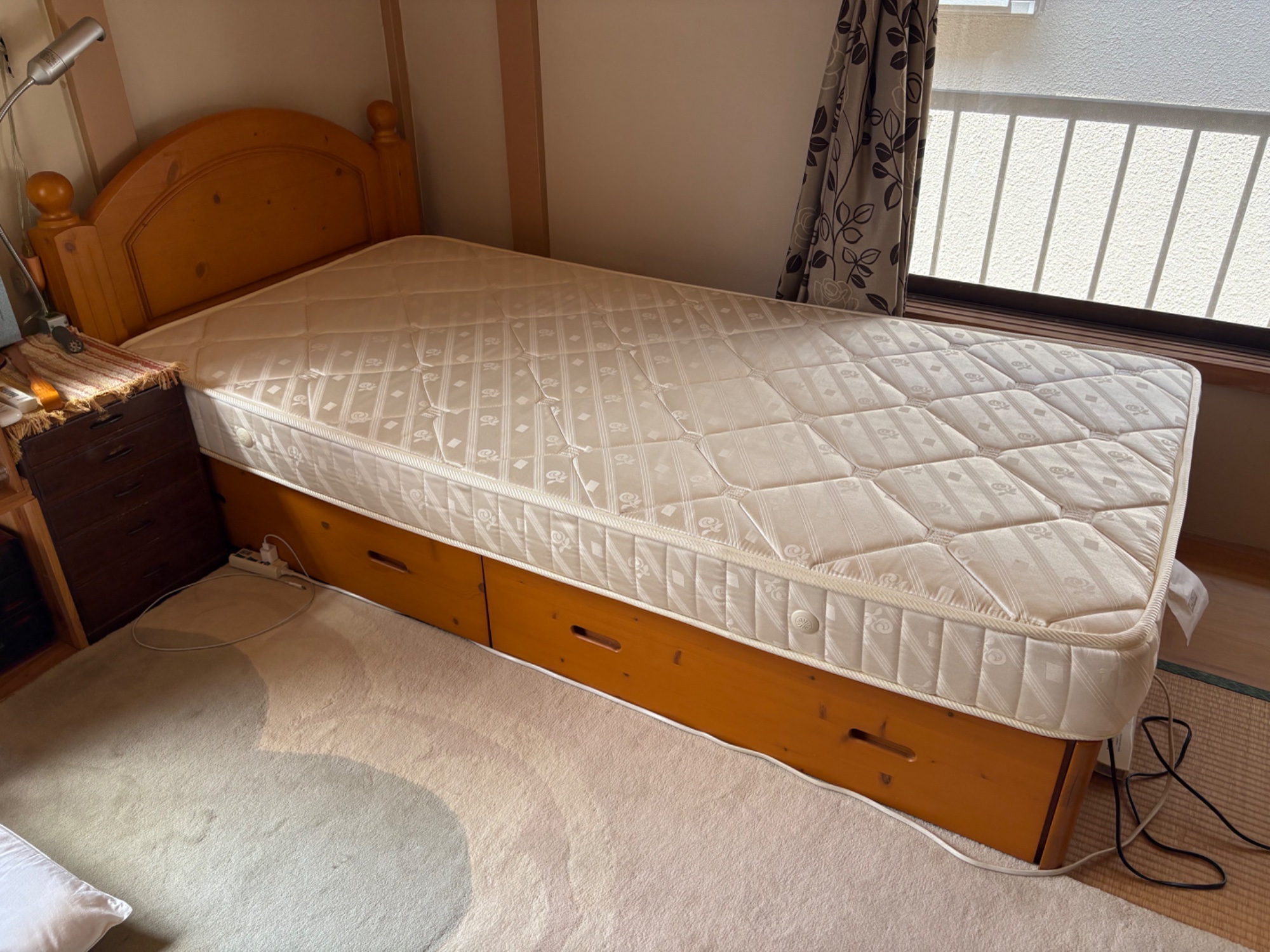 フレームはパイン材のムク材です。引き出し付。マットレスはカバーと敷布団を使っていたので汚れはありませんが、経年劣化シミが有ります。