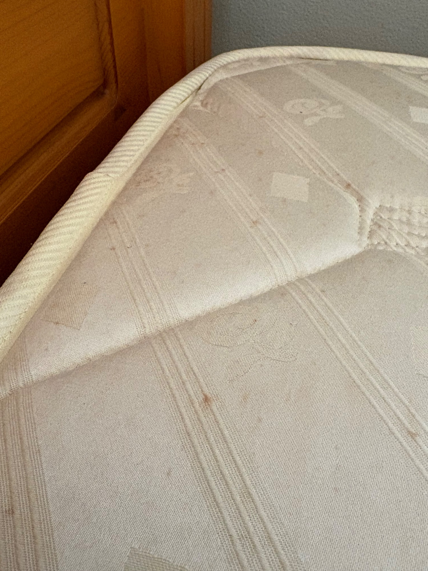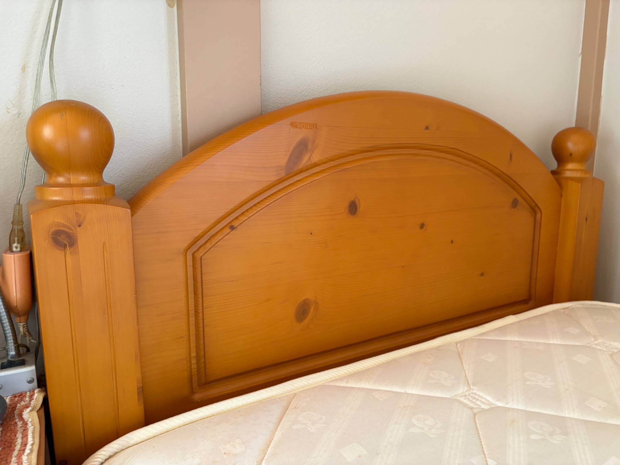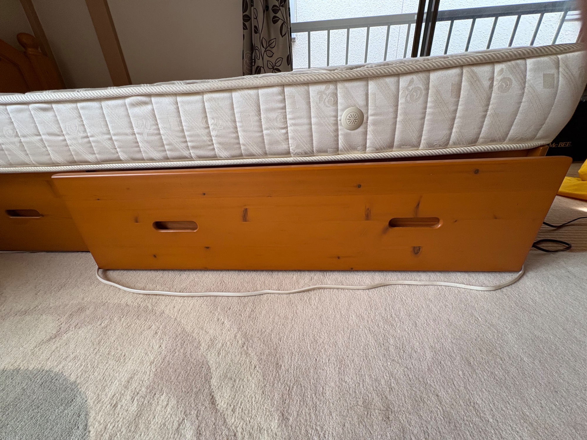 フレームはパイン材のムク材です。引き出し付。マットレスはカバーと敷布団を使っていたので汚れはありませんが、経年劣化シミが有ります。