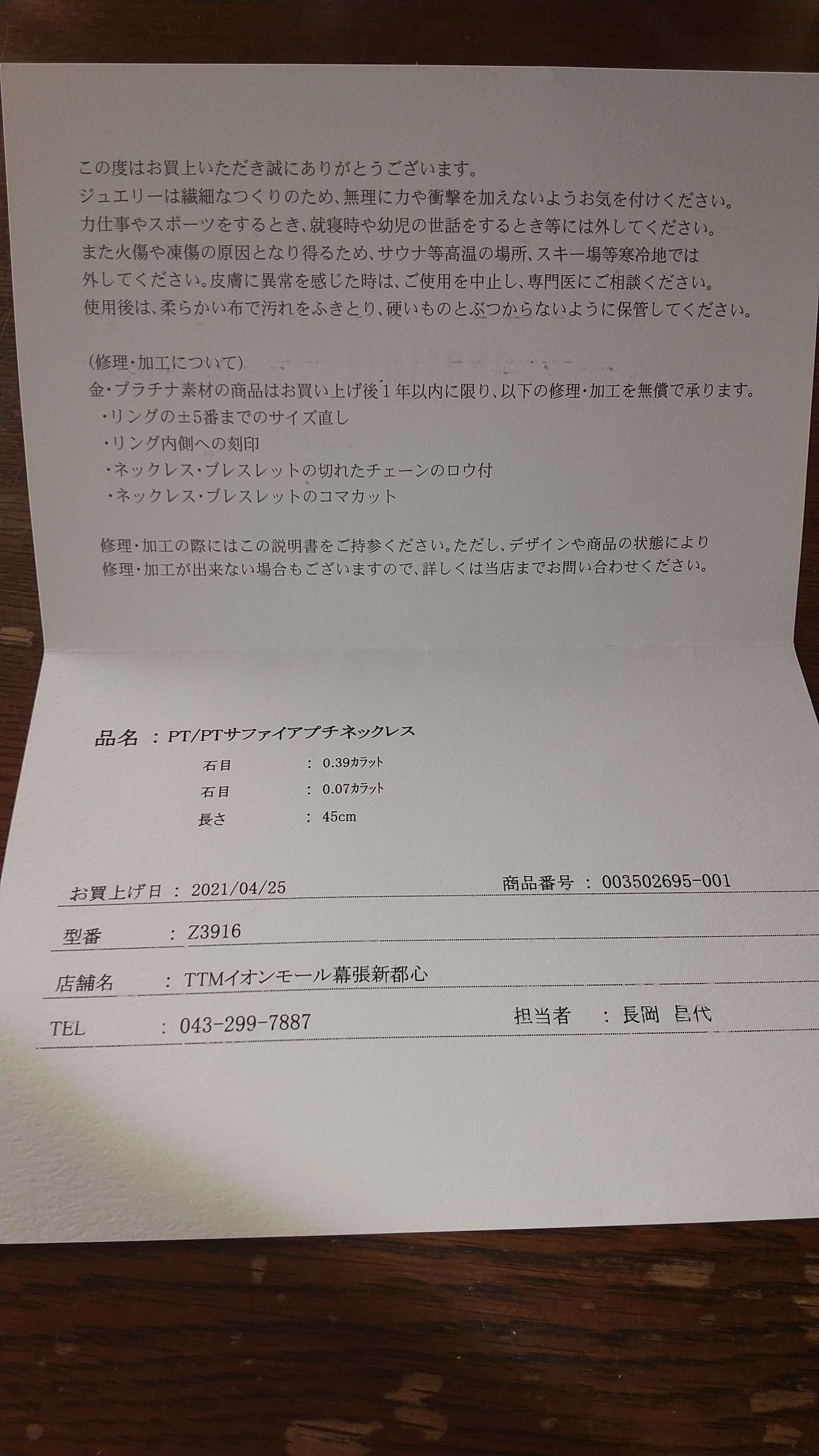 2021年4月25日にプレゼントでいただいたもので、試し付けして外すときにPTのチェーンが切れてしまい、未使用品ですが、別なチェーンに付け替えてしまっておいたものです。