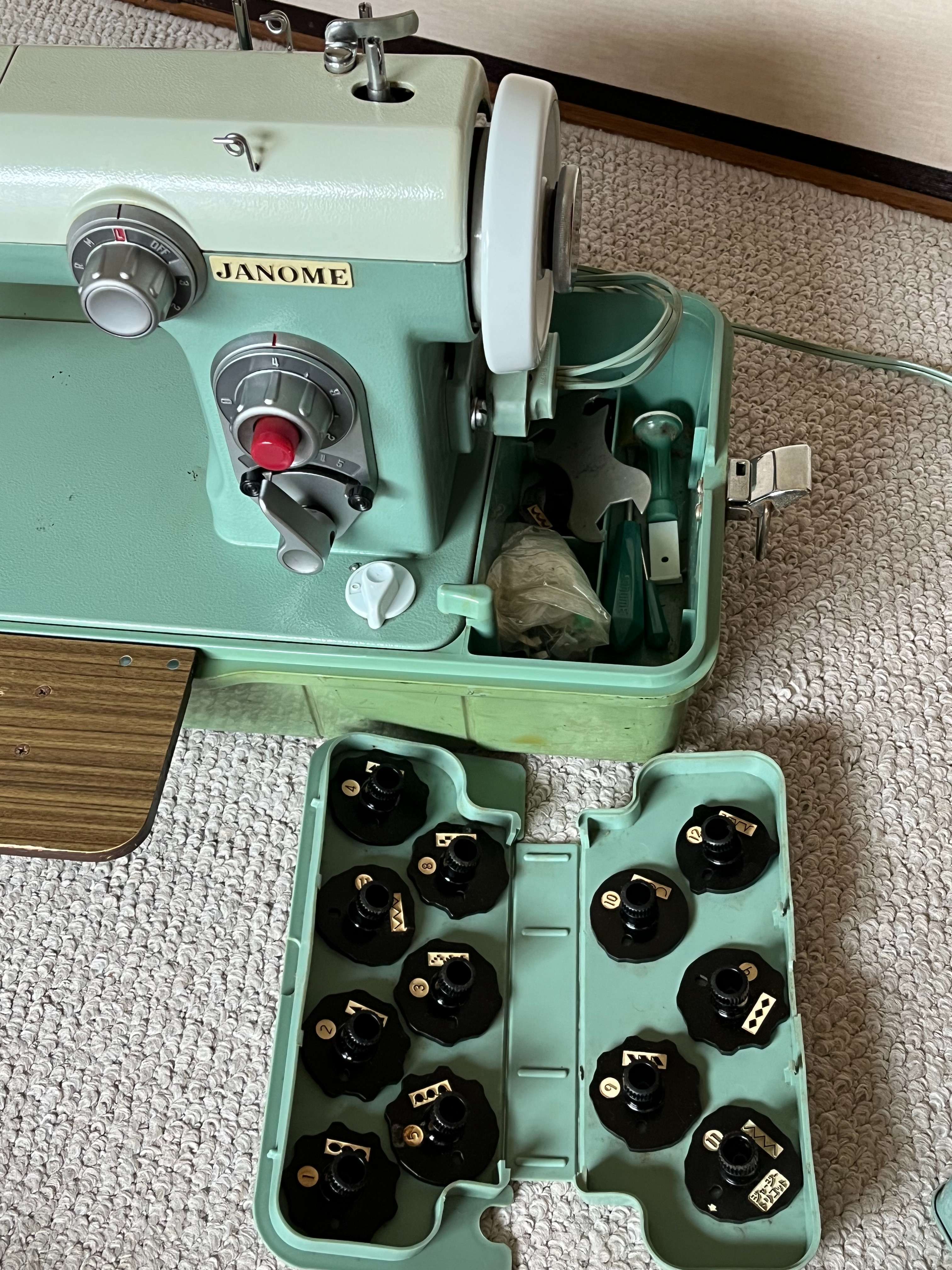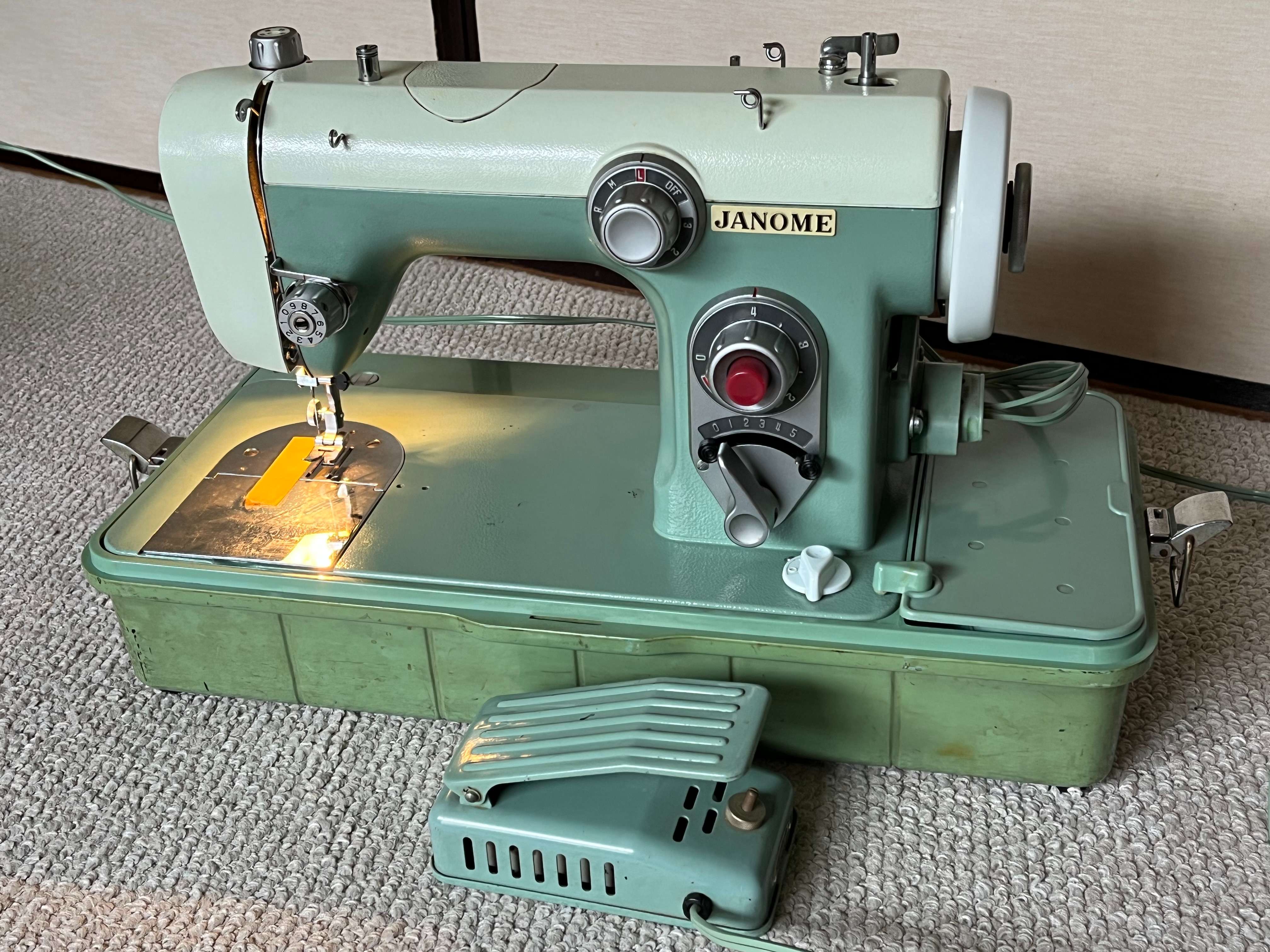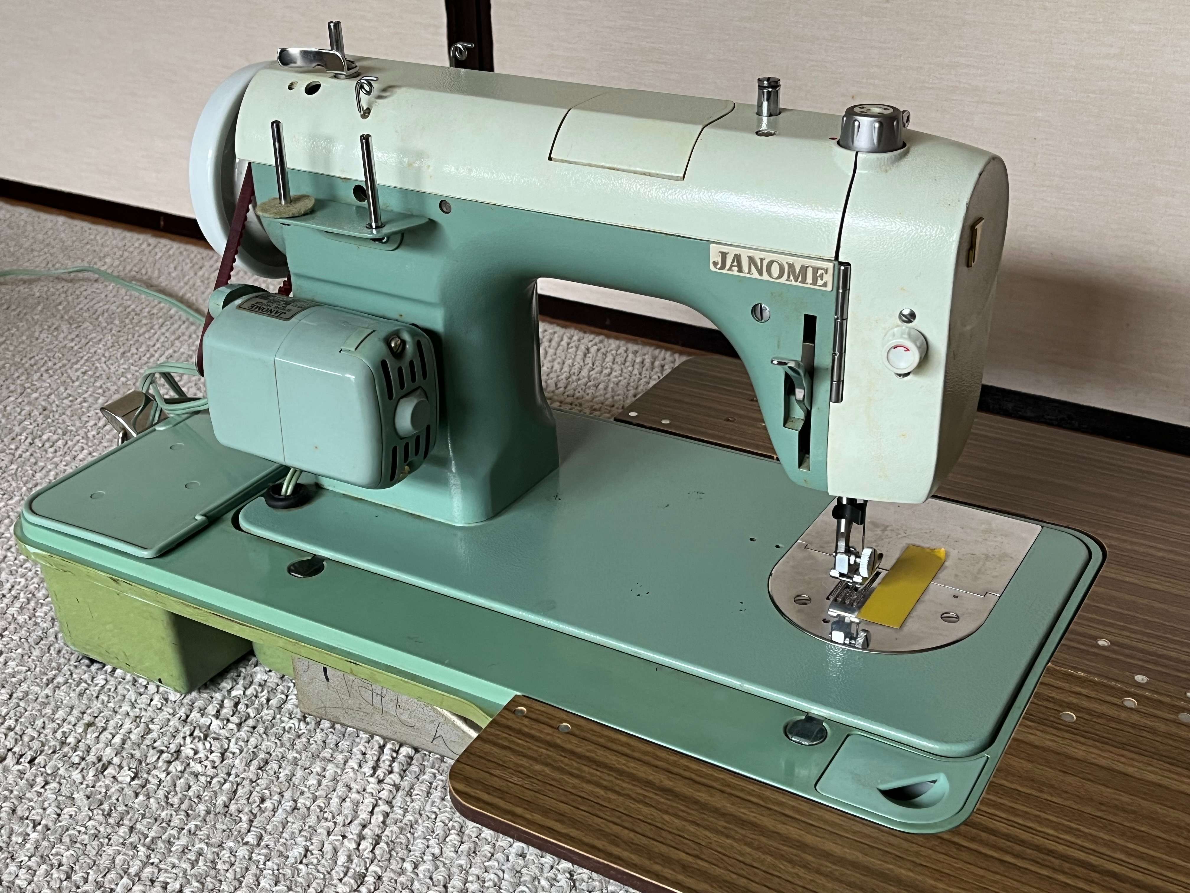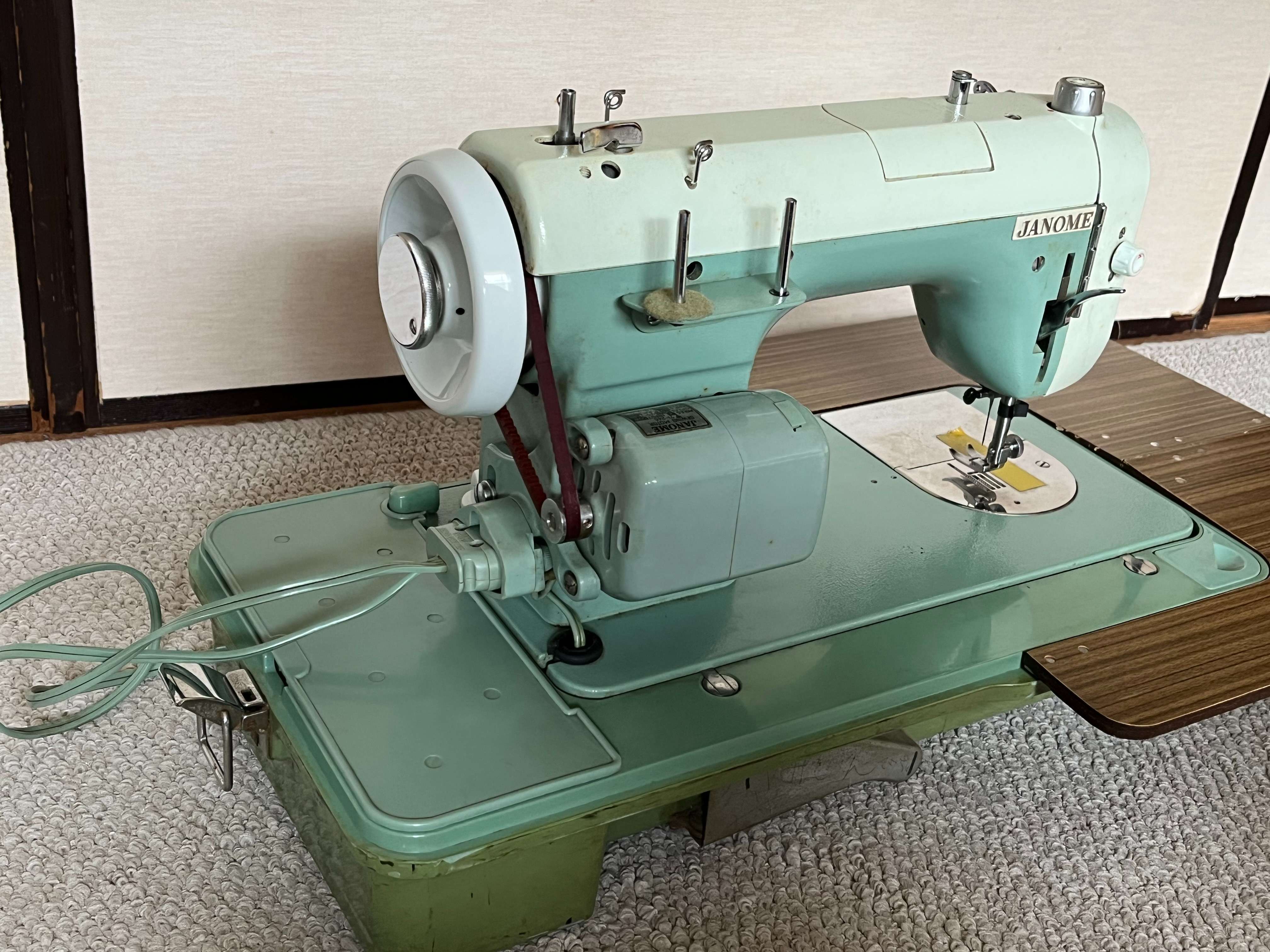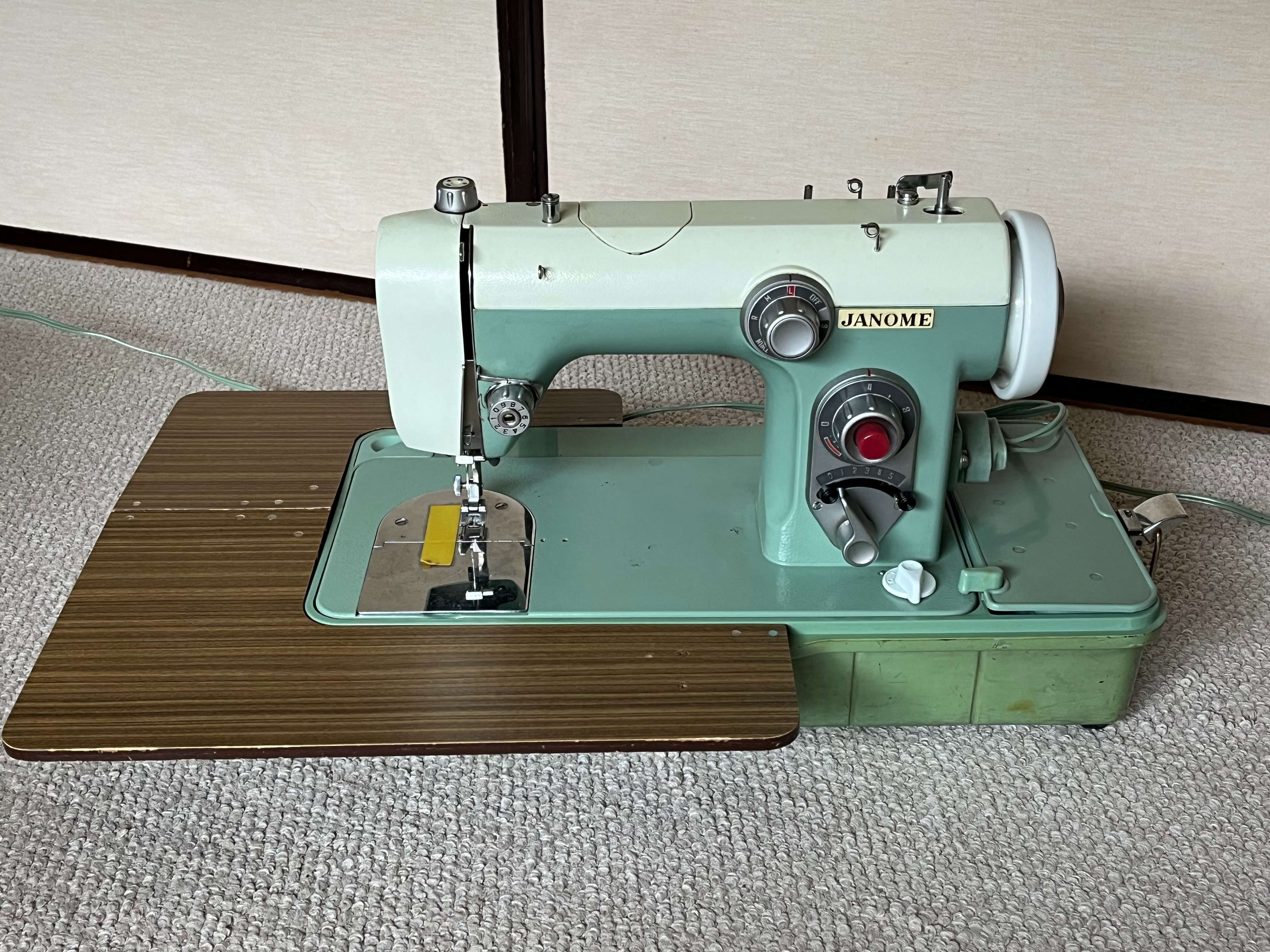 Model#670、新品を購入し当時はよく使用していました。今もまだ使えますが、ここ40年くらいはずっとしまい込んだままでした。写真用に他のミシンから手元電気用電球をつけましたが、このミシン本体には電球はありません。