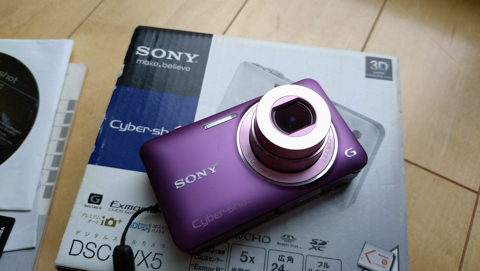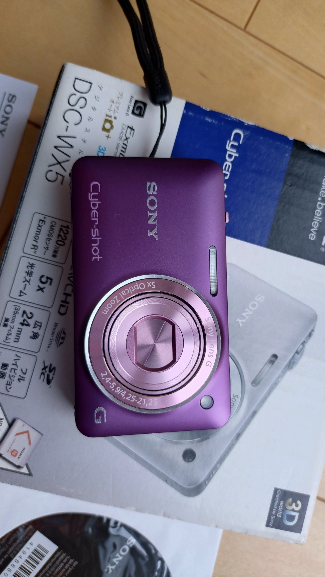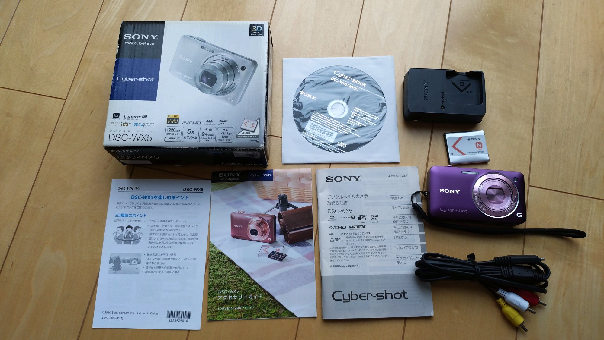 取説、充電器、バッテリー、ストラップ、TVにつなげるコード(3色のコード)、箱あり。箱は経年劣化によるスレあり。本品は美品。