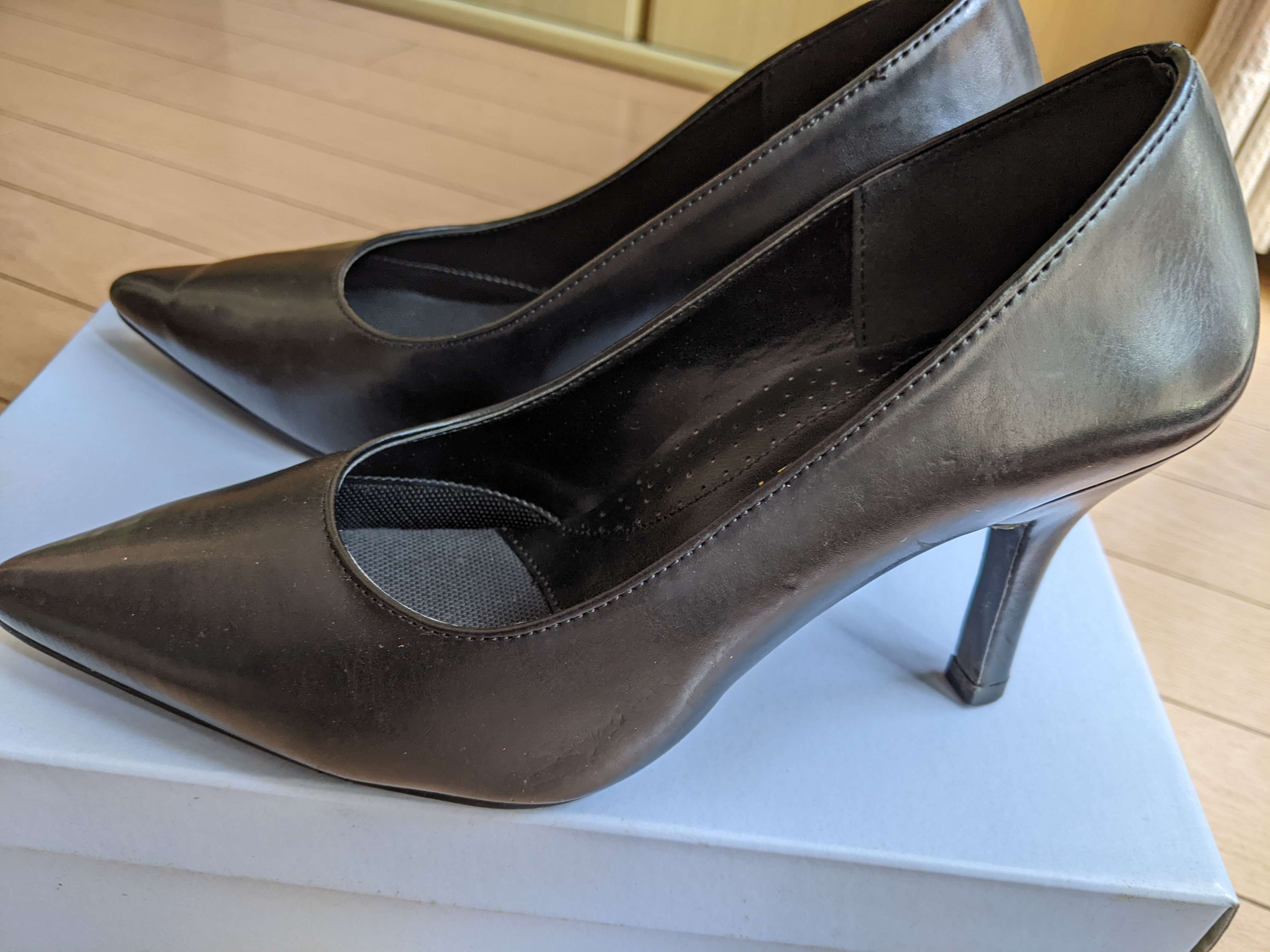 シンプルな黒のパンプスです。測り方がわかりませんがヒールの高さは約7センチでしょうか…