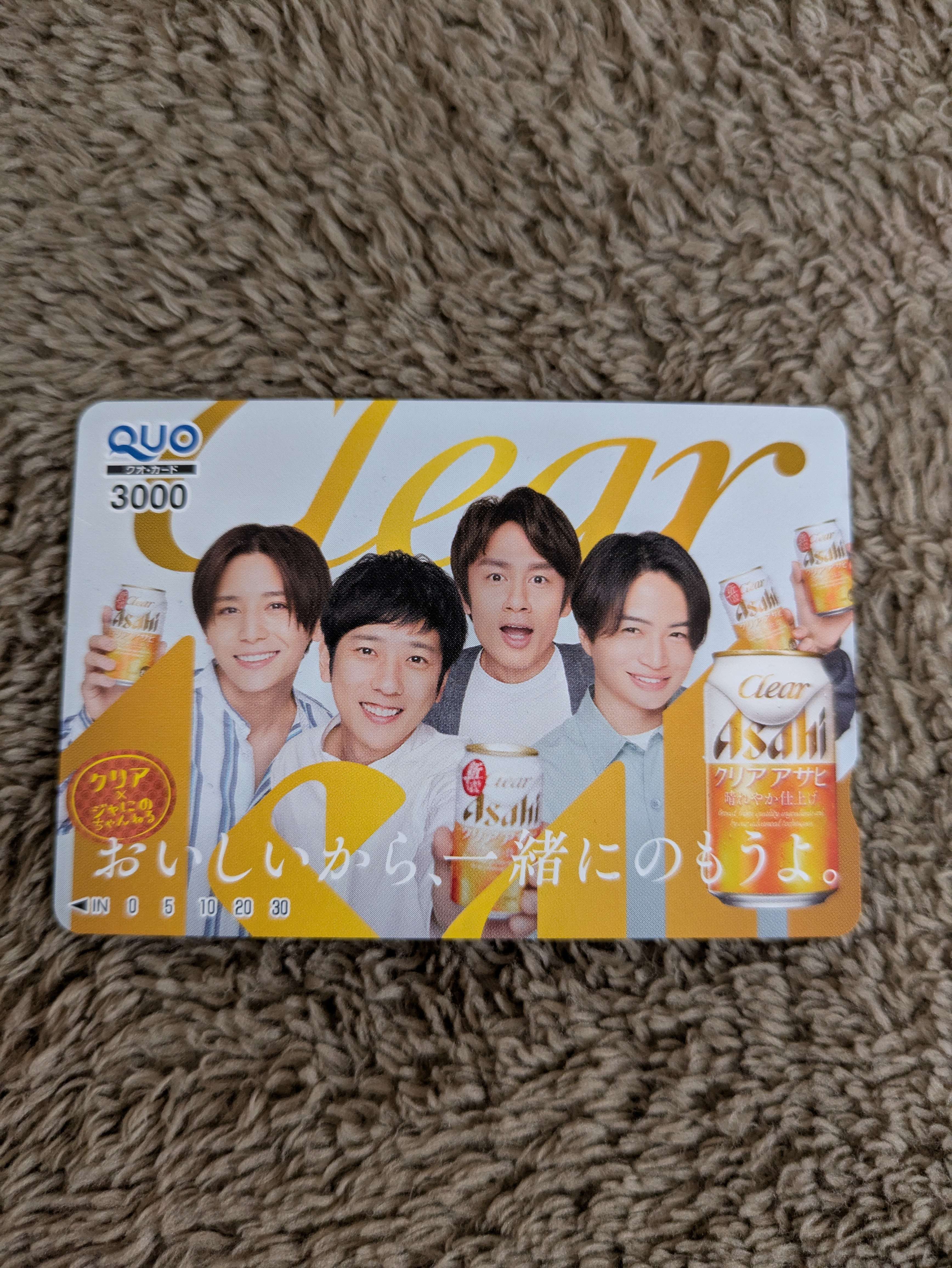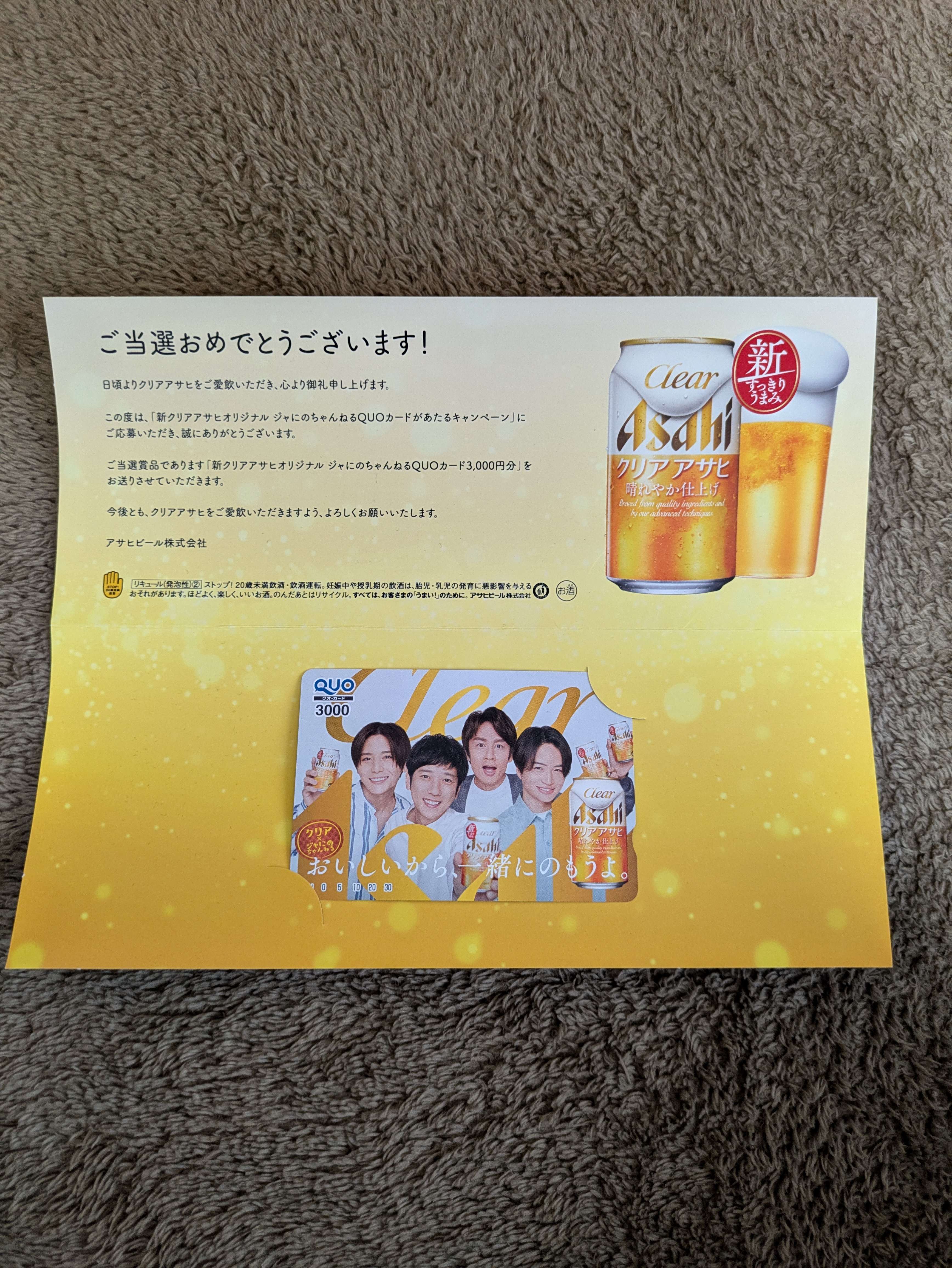 クリアアサヒ景品、じゃにのちゃんねるQUOカード3000円分未使用品