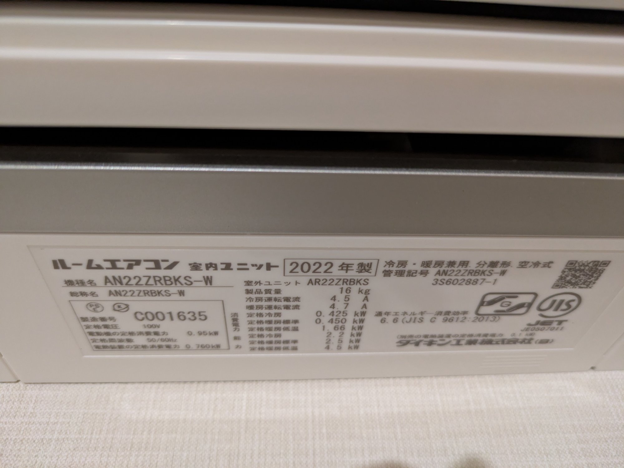 6畳用、2022年製、2022年10月購入、リモコン・説明書あり、使用は夏と冬の夜間のみ