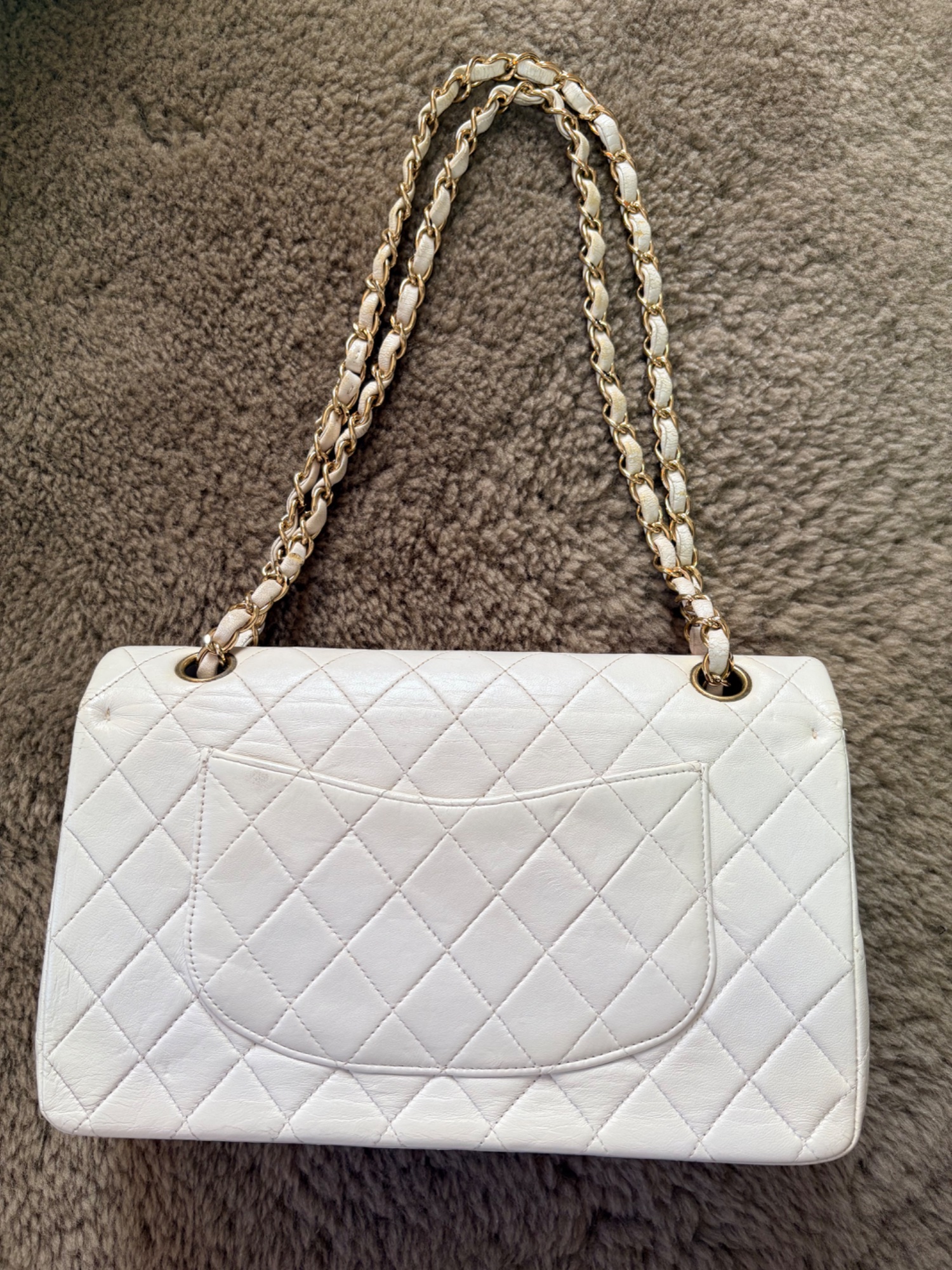 2002年名古屋三越ブティック購入、箱、保存袋、ギャランティーカード有り、チェーン部分の皮にスレ有り、内側の一部、背面のポケットの一部など黄ばみ有り、ベタつき等なし、25×15×6cm