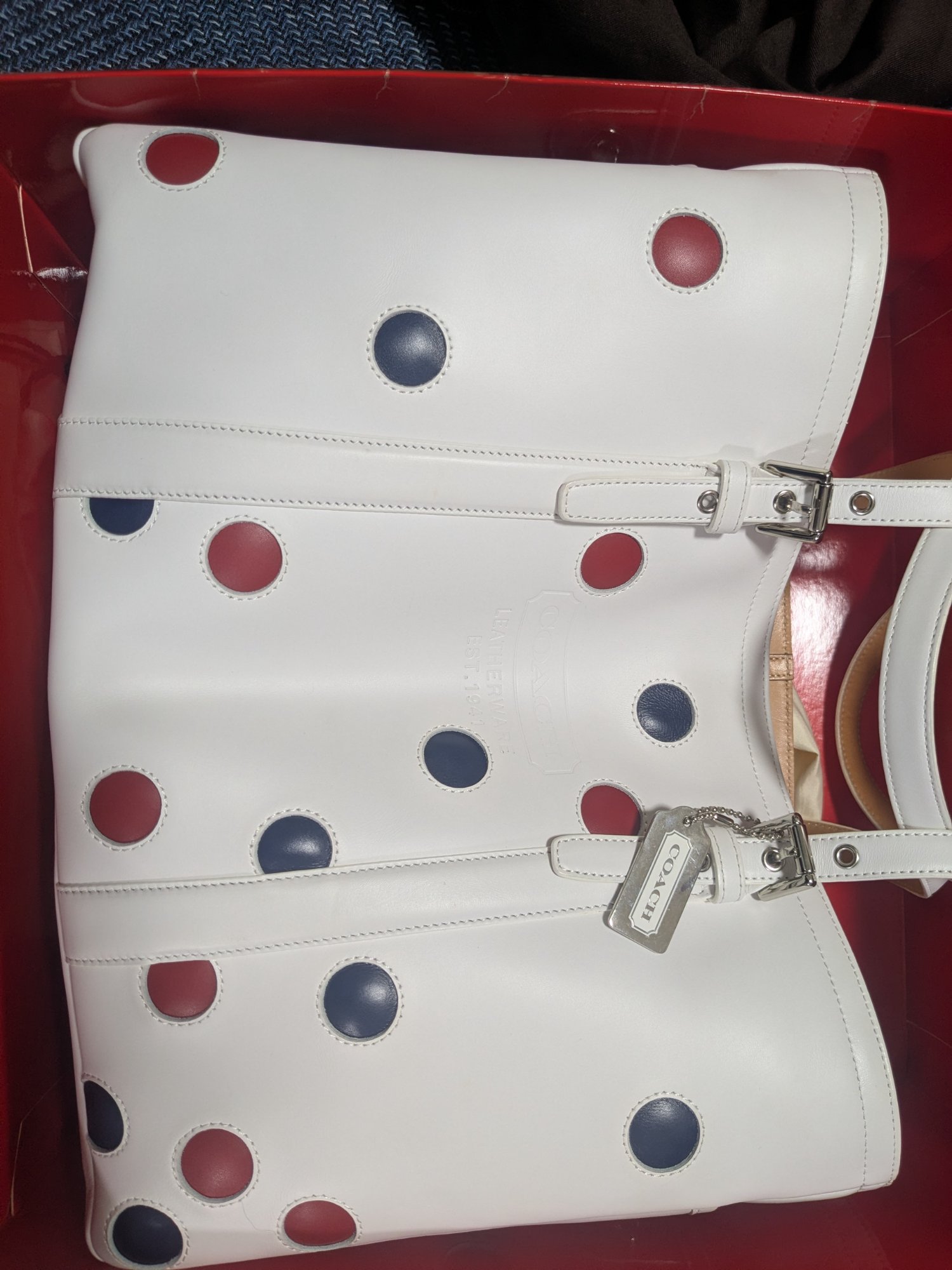 COACHのドット柄トートバッグと水玉の配置が一致しますが、色が異なっています。何度か使用したようで、多少汚れがあります。